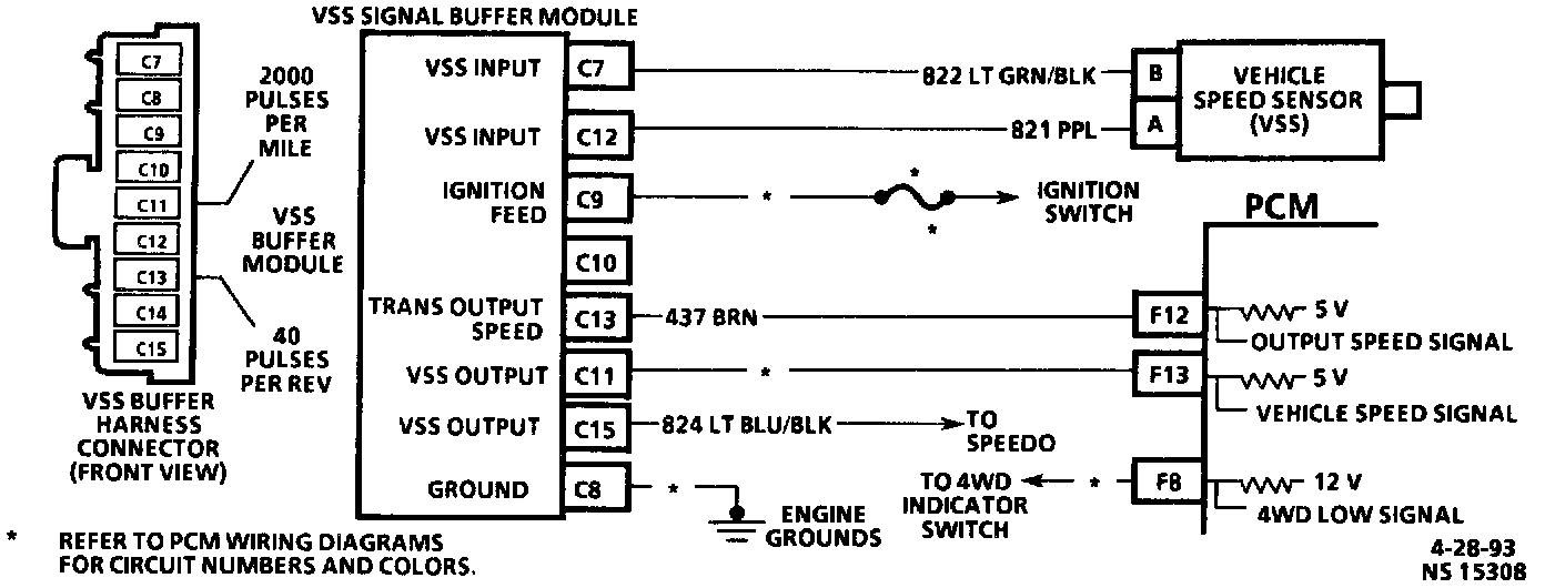 The speed sensor circuit consists of a magnetic induction type sensor, a Vehicle Speed Signal (VSS) buffer module, 4WD low switch (when needed), and wiring. Gear teeth pressed onto the output shaft induces an alternating voltage into the sensor. This signal is transmitted to the VSS buffer module. The VSS buffer module compensates for various final drive ratios. The VSS buffer module will also convert the AC VSS signal into a 40 pulse per revolution (PPR) DC signal on CKT 437 to indicate transmission output speed. On 4WD vehicles, the 4WD low signal will also be used for adjustment of the 40 PPR signal to the PCM.