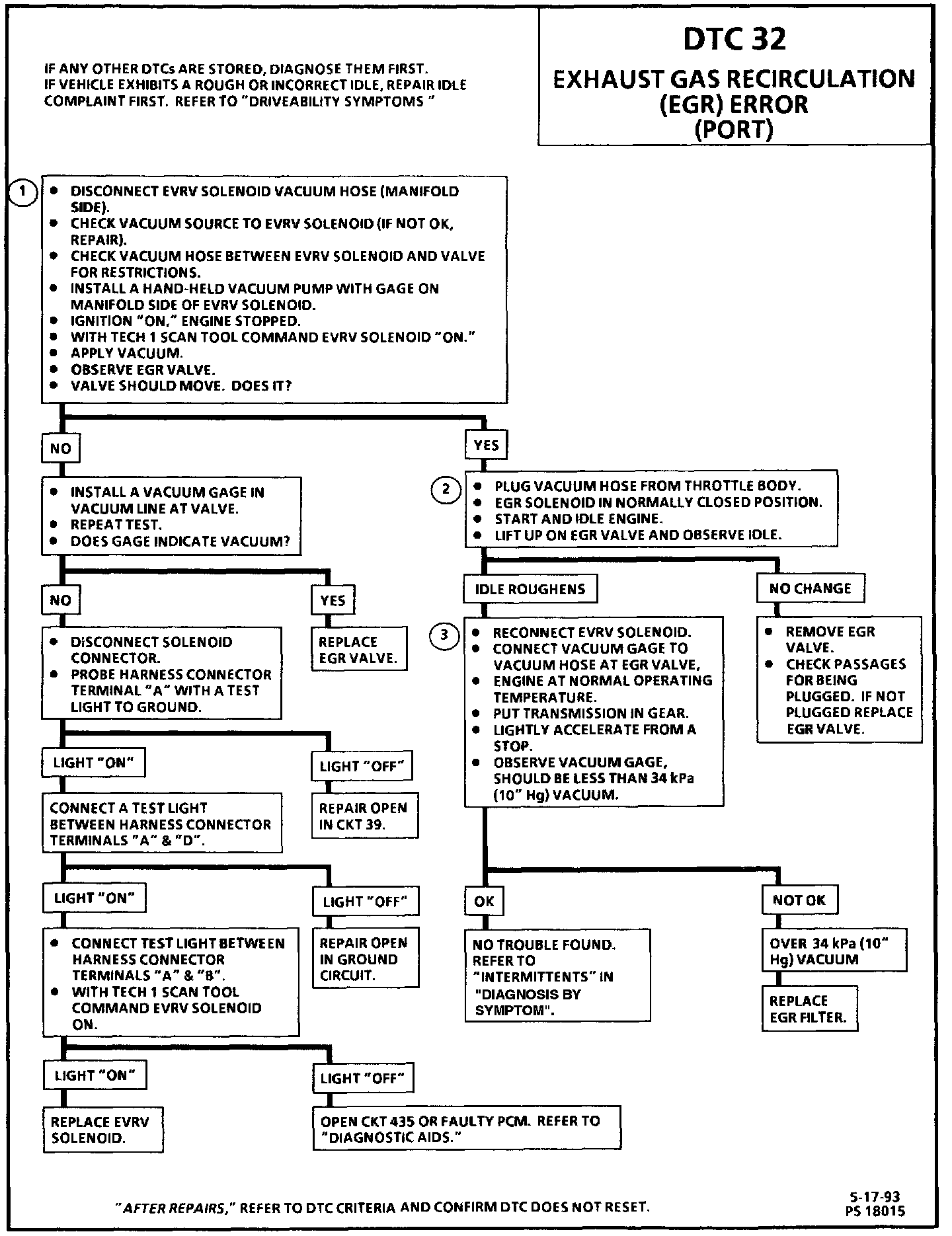 The PCM monitors EGR effectiveness by de-energizing the EGR control solenoid, thereby, shutting "OFF" vacuum to the EGR valve diaphragm. With the EGR valve closed, and O2S fluctuating normally, fuel integrator counts will be greater than they were during normal EGR operation. If the change is not within the calibrated window, after failing the test twice a DTC 32 will be set.