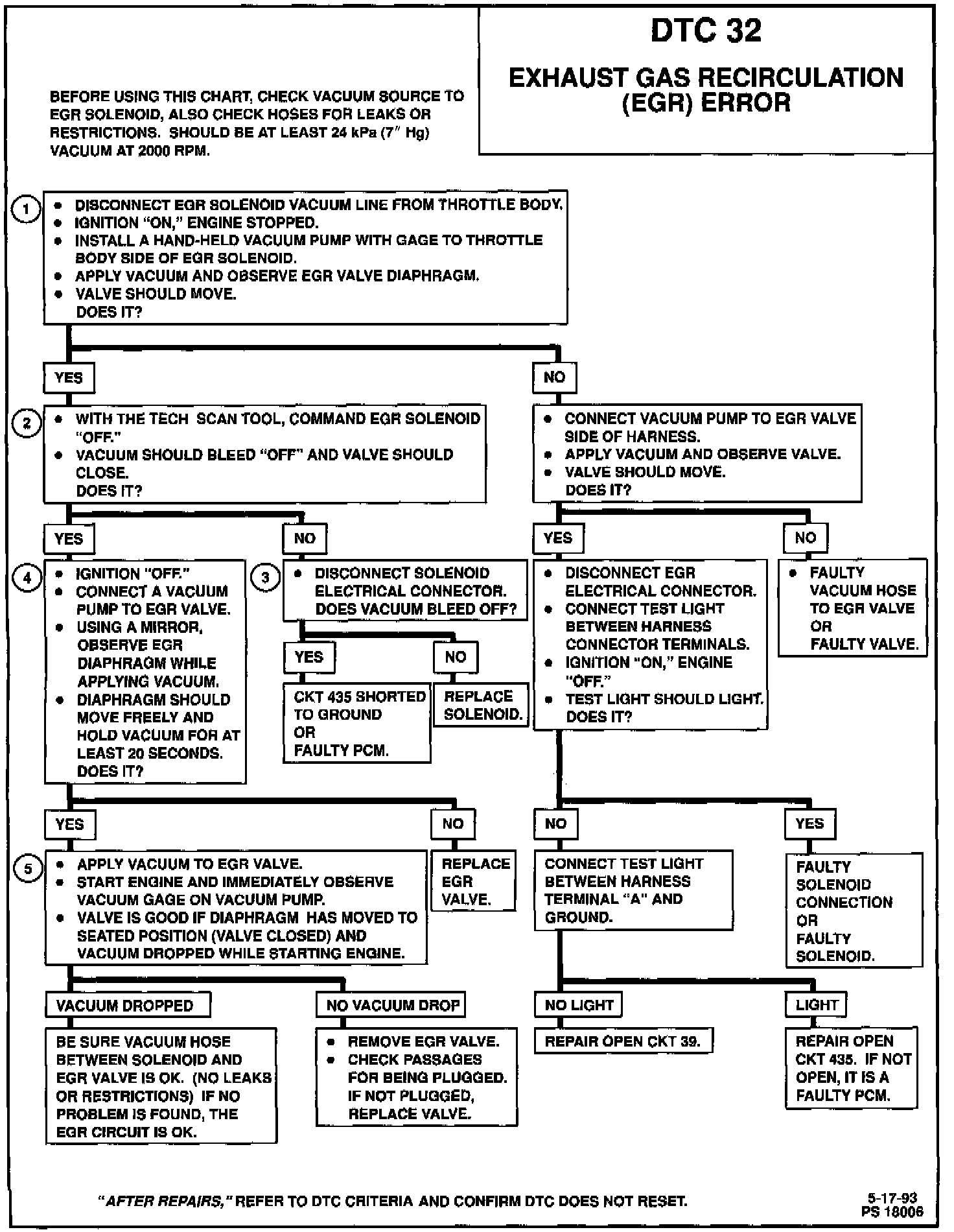 The PCM monitors EGR effectiveness by de-energizing the EGR control solenoid, thereby, shutting "OFF" vacuum to the EGR valve diaphragm. With the EGR valve closed, and O2S fluctuating normally, fuel integrator counts will be greater than they were during normal EGR operation. If the change is not within the calibrated window, after failing the test twice a DTC 32 will be set.