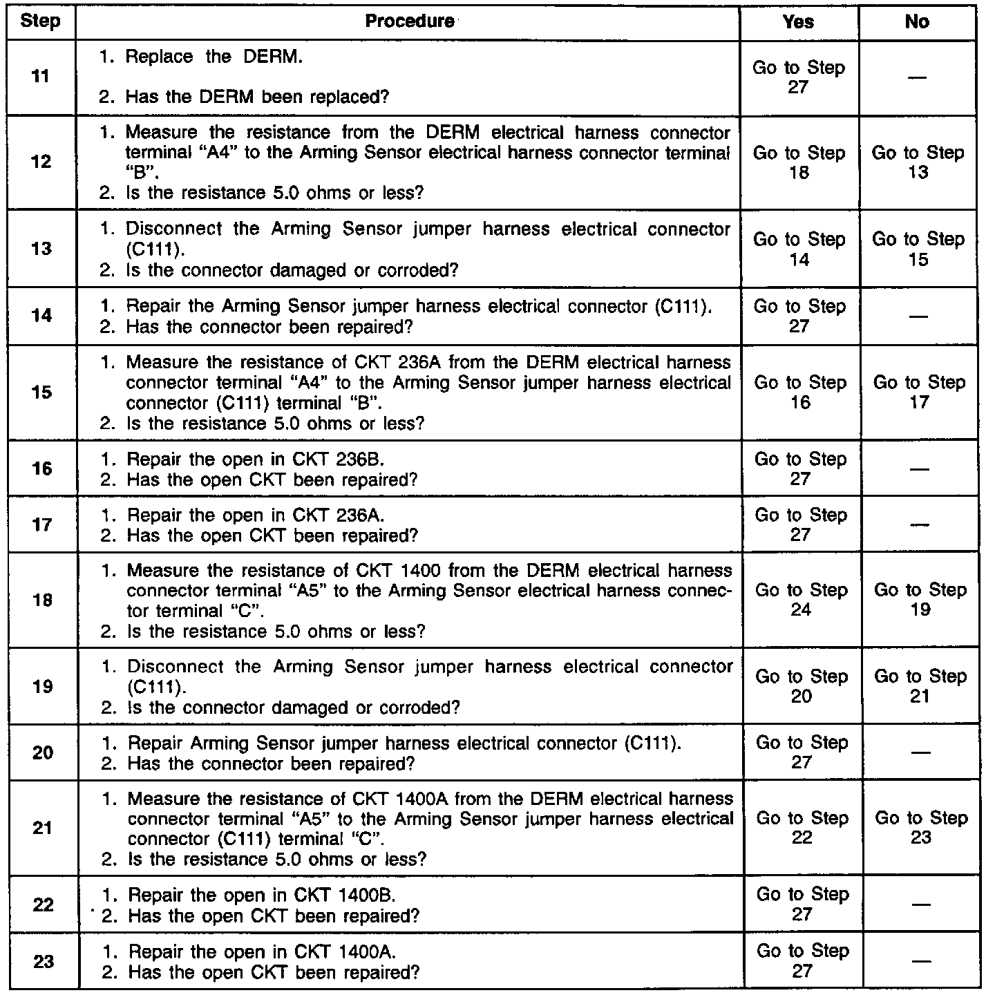 An intermittent condition is likely to be caused by a poor connection at arming sensor or arming sensor jumper harness electrical connector terminal "B" or "C," poor connection at DERM terminal "A4" or "A5," an open in CKT 236 or CKT 1400, or an open inside the arming sensor.