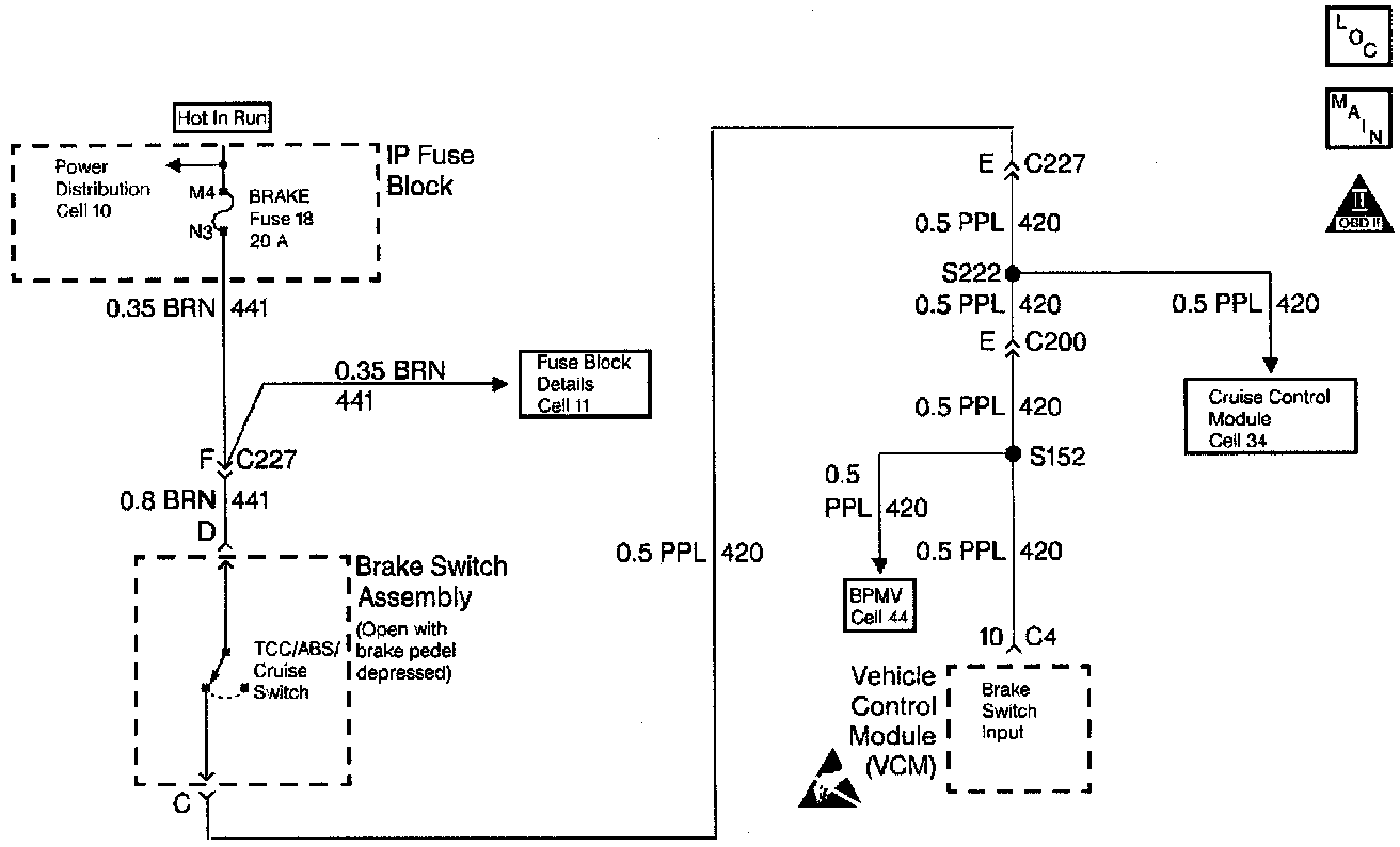 The brake switch indicates the brake pedal status. The normally-closed brake switch supplies a B+ signal on circuit 420 to the Vehicle Control Module (VCM). The signal voltage circuit opens when the brakes are applied. The VCM uses the open signal voltage circuit in order to de-energize the TCC PWM Sol. Valve when the brakes are applied.