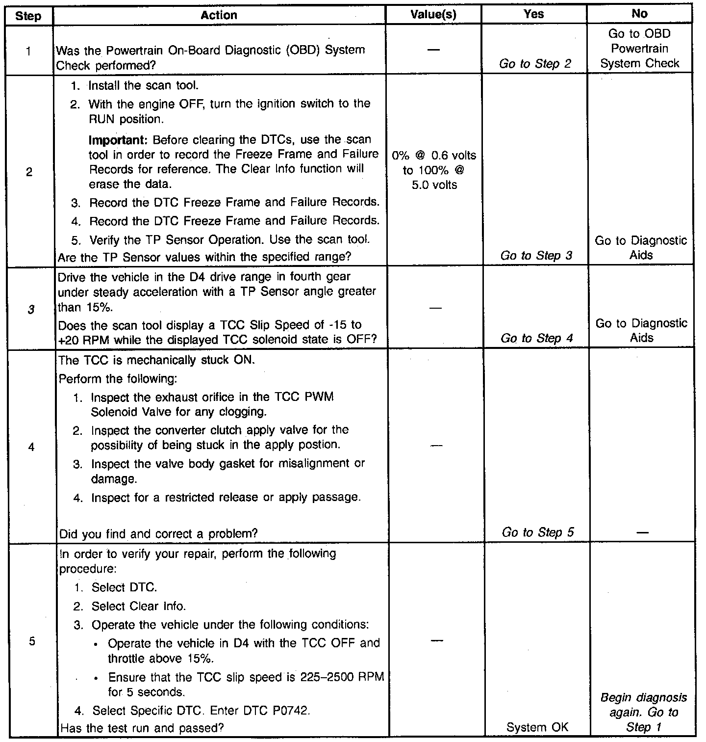 When the Vehicle Control Module (VCM) detects low torque converter slip when the Torque Converter Clutch (TCC) is commanded OFF, then DTC P0742 sets. DTC P0742 is a type D DTC. For California emission vehicles DTC P0742 is a type B DTC.