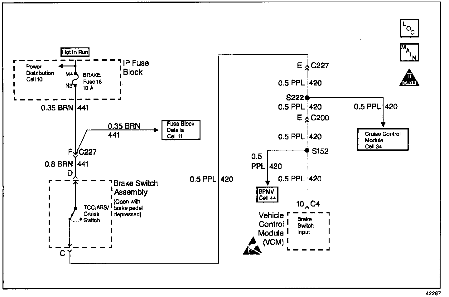 The brake switch indicates the brake pedal status. The brake switch is normally-closed. The brake switch supplies a B+ signal on circuit 420 to the Vehicle Control Module (VCM). The signal voltage circuit is opened when you apply the brakes. The VCM uses this signal in order to de-energize the TCC Sol. Valve when you apply the brakes.