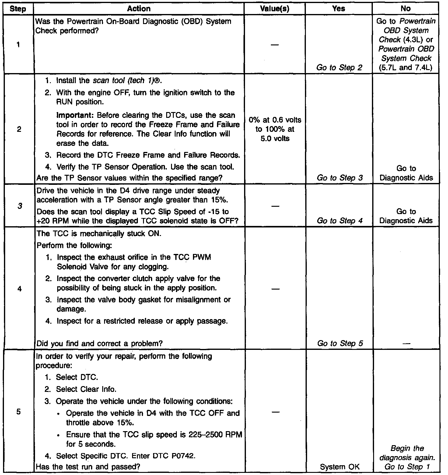 When the VCM detects low torque converter slip when the TCC is commanded OFF, then DTC P0742 sets. DTC P0742 is a type D DTC. For California emission vehicles DTC P0742 is a type B DTC.