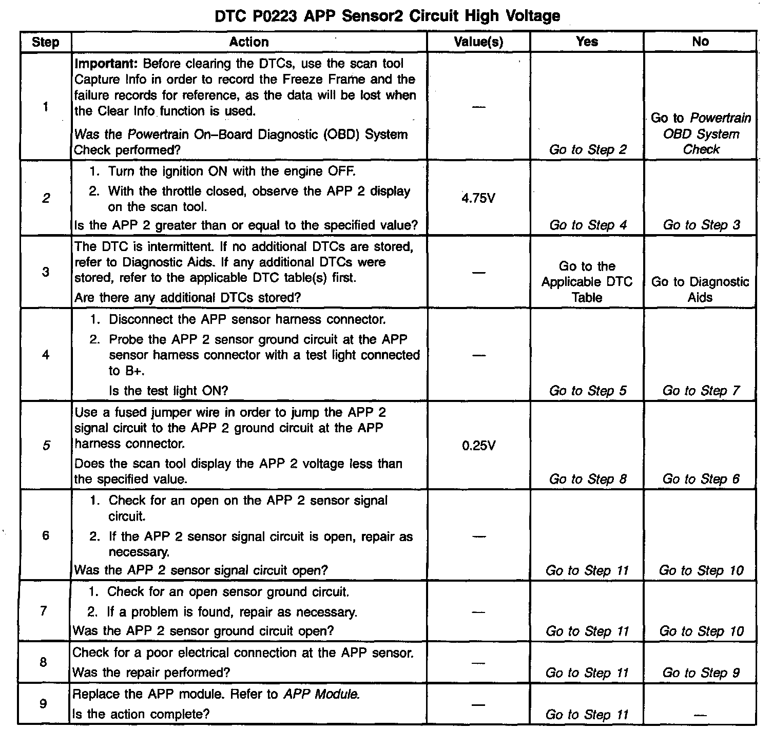 A scan tool reads the APP 2 position in volts and should read about 4.5 volts with the throttle closed and the ignition ON or at idle. The voltage should decrease at a steady rate as the throttle is moved toward Wide Open Throttle (WOT). Also, 90% pedal travel is acceptable for a correct APP operation. Scan the APP 2 signal while depressing the accelerator pedal with the engine stopped and the ignition ON. The display should vary from about 4.5 volts when the throttle is closed to about 1.5 volts when the throttle is held at a Wide Open Throttle (WOT) position. A P1125 may possibly set along with a P0223 if the signal circuit is open.
