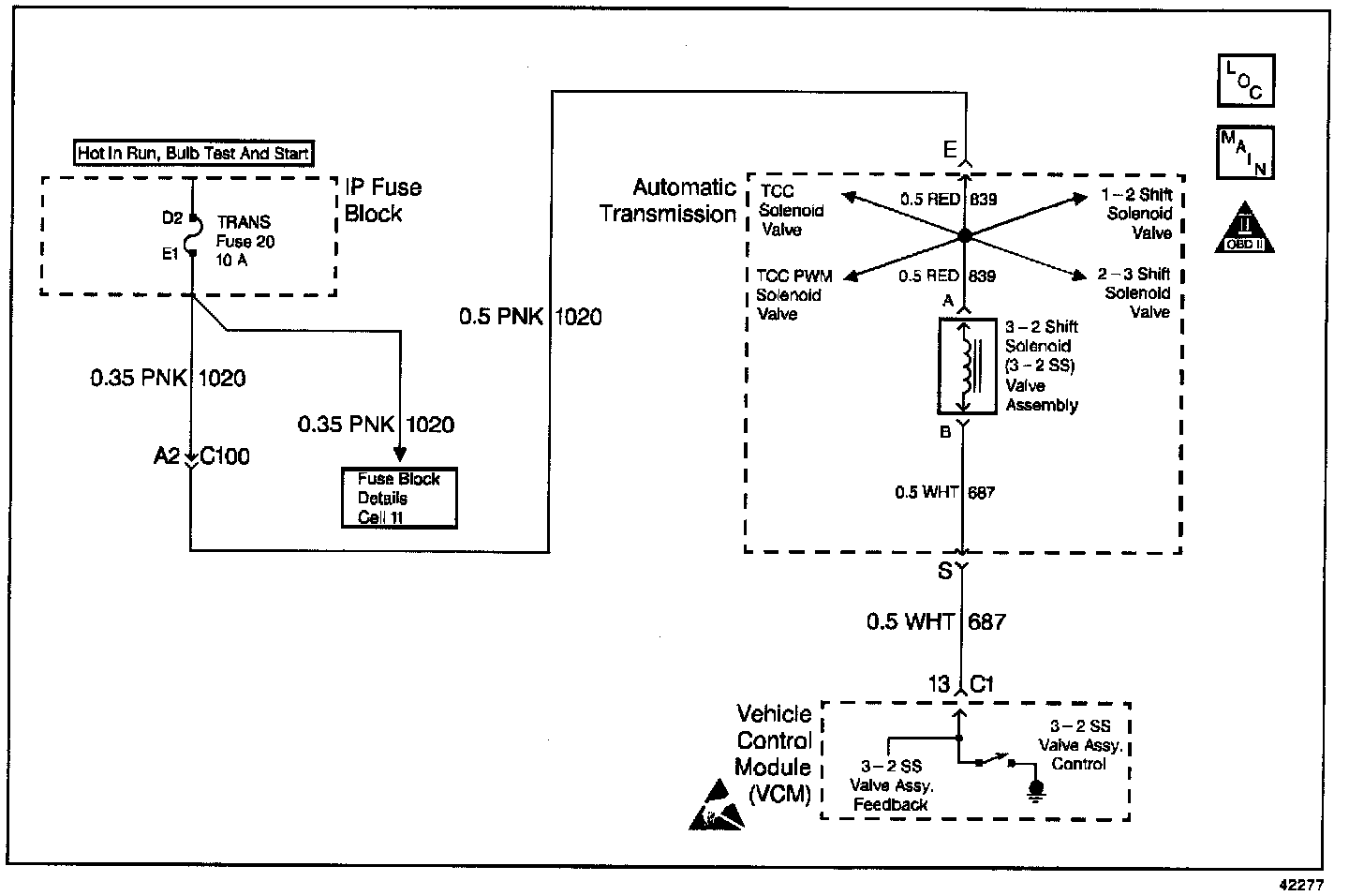 The 3-2 Shift Solenoid Valve Assembly (3-2 SS Valve Assy.) is a normally-closed, 3-port, on/off device that controls the 3-2 downshift. The solenoid attaches to the control valve body within the transmission. The solenoid receives ignition voltage through circuit 1020. The Vehicle Control Module (VCM) controls the solenoid by providing a ground path on circuit 687. During a 3-2 downshift, the 2-4 band applies as the 3-4 clutch releases. The VCM varies the timing between the 3-4 clutch release and the 2-4 band apply depending on the vehicle speed and the throttle position.