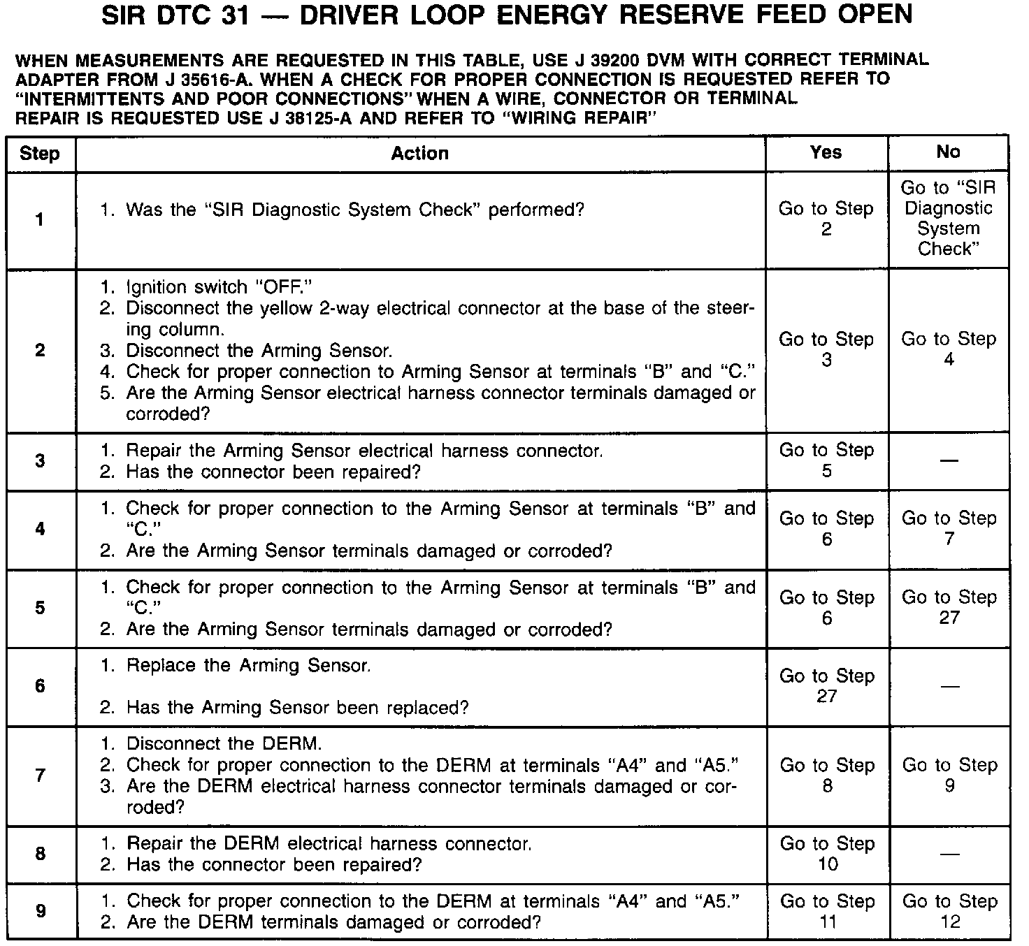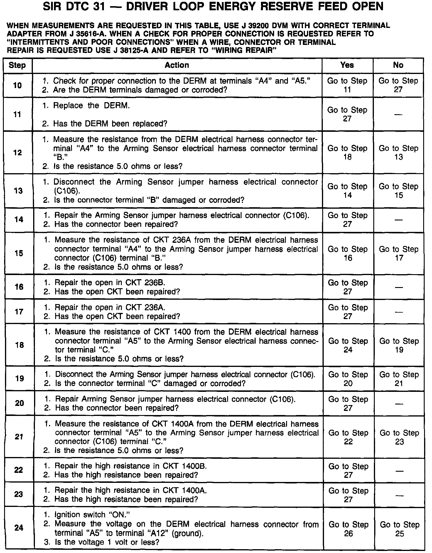 During the "Continuous Monitoring" tests the DERM monitors the voltage at "Driver Source Sense" terminal "A5." When the circuit is operating normally the measured voltage will be slightly less than "Driver 36 VLR." If the "Driver 36 VLR" circuit opens, the voltage measured at "Driver Source Sense" will decrease to slightly less than "Ignition 1" voltage. When the voltage measured at "Driver Source Sense" is within a specified range of "Ignition 1," for 500 milliseconds, DTC 31 is set.