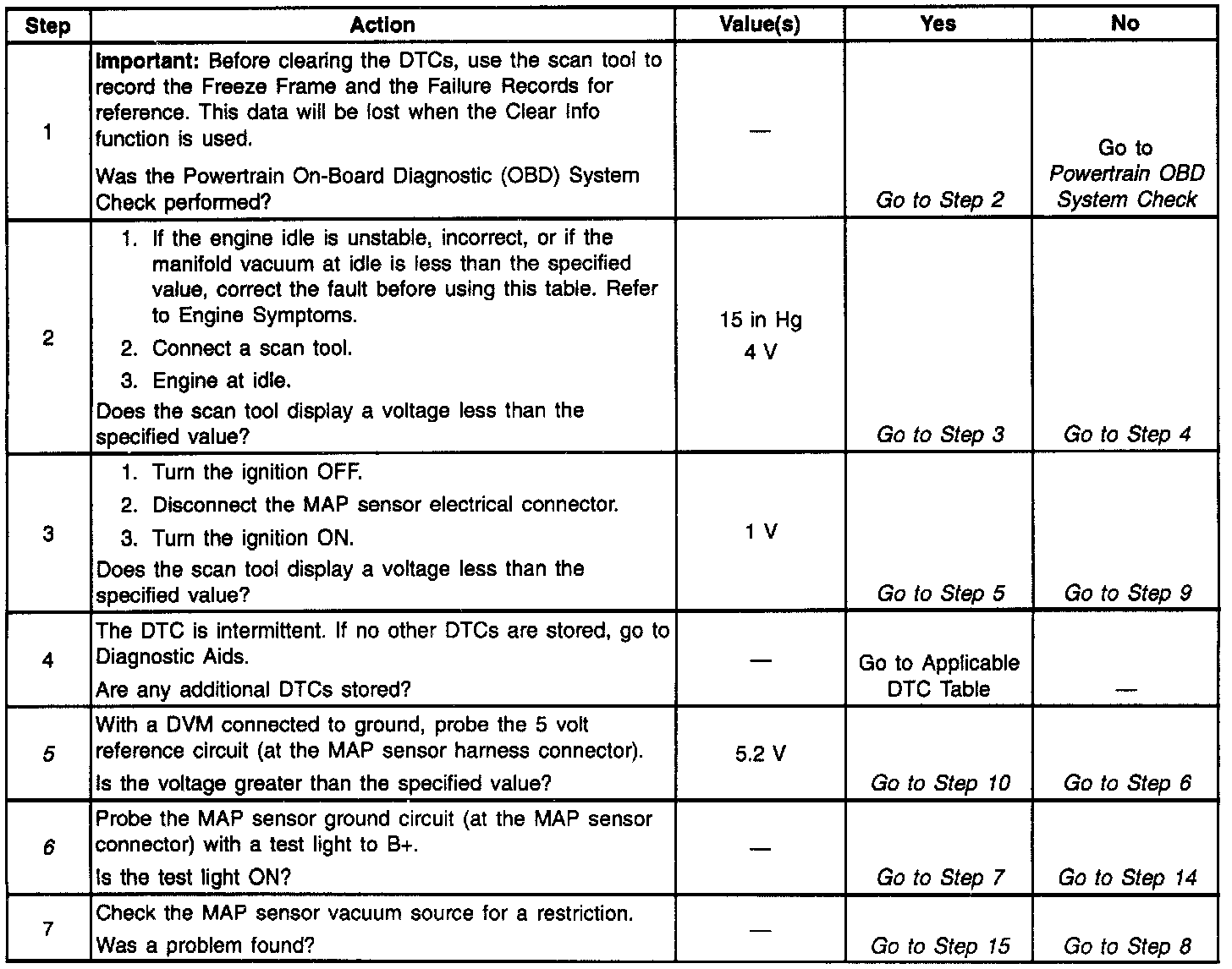 The Manifold Absolute Pressure (MAP) sensor responds to changes in intake manifold pressure (vacuum). A 5 volt reference is applied to the sensor on the 5 volt reference circuit. A variable resistor moves in relation to the manifold pressure and a voltage signal is sent back to the Vehicle Control Module (VCM) on the MAP signal circuit. This voltage signal varies from 1.0-1.5 volts at closed throttle to 4.0-4.6 volts at wide open throttle (low vacuum). The VCM utilizes the MAP signal and throttle position in order to determine the correct amount of fuel delivered to the engine. This DTC is a type A DTC.