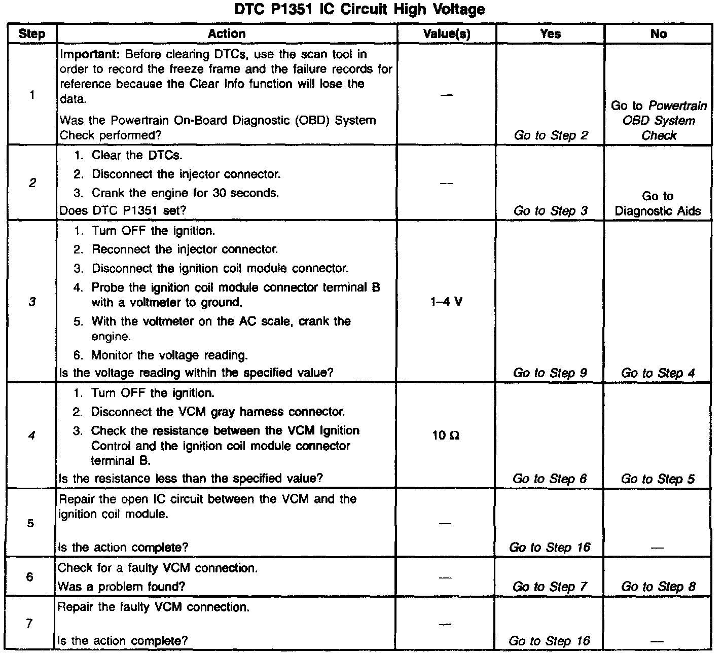 Once the VCM calculates the ignition timing. the ignition coil module on the IC circuit receives the timing signal. Each timing pulse received by the ignition coil module. on the IC circuit, triggers the coil module in order to operate the ignition coil. The secondary ignition voltage is induced, and then the secondary ignition voltage is sent to the distributor for distribution to each spark plug. This DTC is a type A DTC.