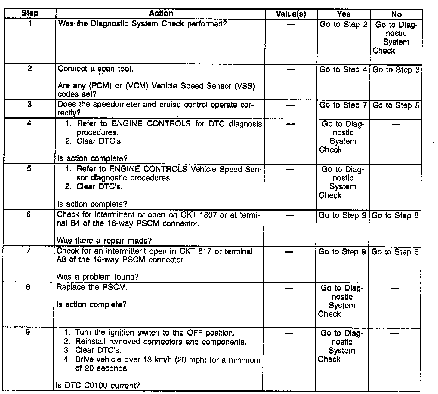 The step numbers below refer to the same step numbers in the Vehicle Speed Information Circuit Malfunction Diagnostic Table.