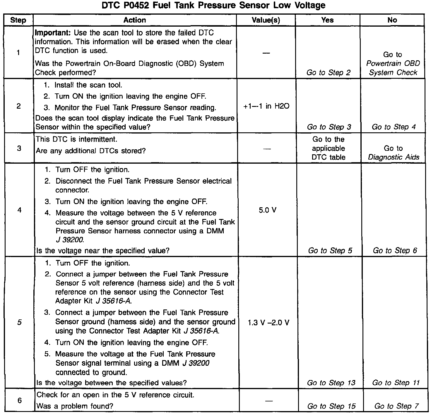 The Fuel Tank Pressure Sensor diagnosis table is intended to isolate and diagnose the electrical problems with the sensor wiring or the sensor.