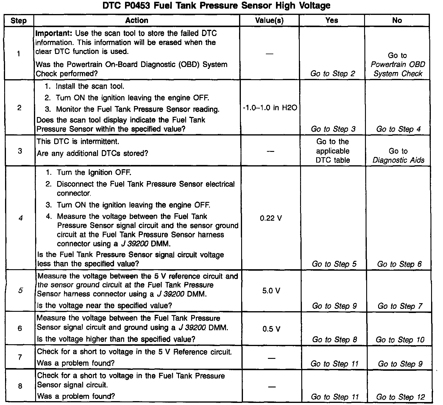 The Fuel Tank Pressure Sensor diagnosis table is intended to isolate and diagnose the electrical problems with the sensor wiring or the sensor.