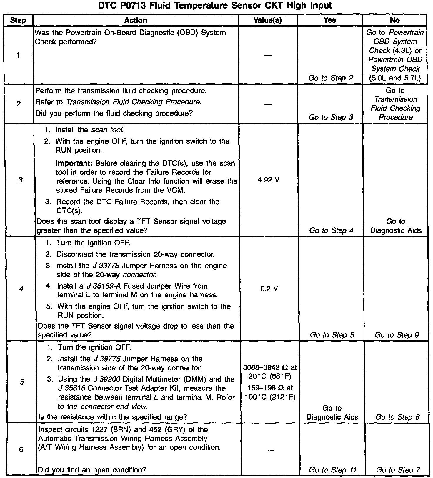 When the VCM detects a continuous open or short to power in the TFT signal circuit or the TFT Sensor, then DTC P0713 sets. DTC P0713 is a type D DTC.