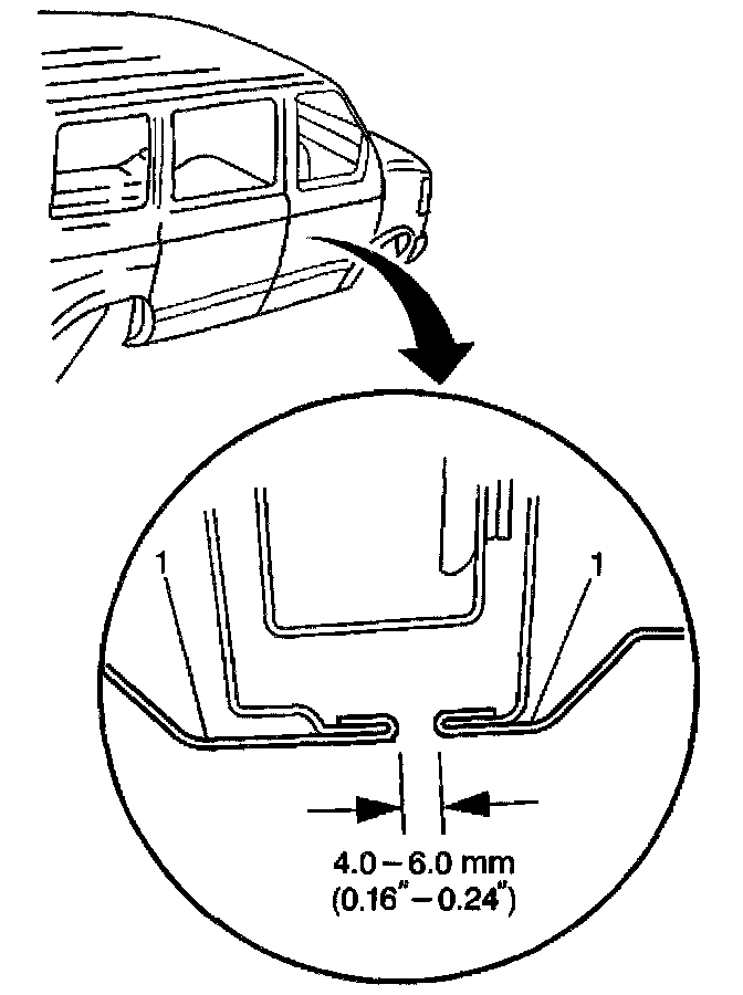 15. Adjust the center roller track for and aft in order to obtain equal gaps between the sliding door (1), the quarter panel, and the front door.