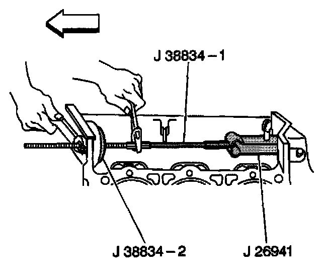 1.2. Install the J 38834- 1 with the short threaded end through the balance shaft bore in the front of the engine block.