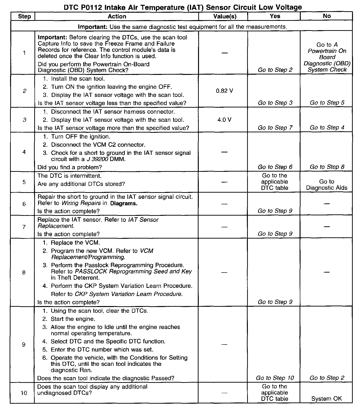 The IAT sensor indicates the temperature of the ambient air entering the throttle body. The IAT sensor temperature should read very close to the temperature of the outside air. The IAT sensor temperature should rise gradually as the engine warms up and the underhood temperature increases. If DTC P112 is set, the problem is intermittent. Check for a short to ground in the IAT sensor signal circuit. This may be accomplished by moving the VCM harness at various locations and monitoring the IAT temperature or the IAT voltage on the scan tool. If the voltage varies, look for a short to ground in the area of the harness that caused the variance. Also, a sensor may become skewed or mis-scaled. The Temperature vs. Resistance Value Table will help to detect a skewed sensor. Refer to Temperature vs Resistance.