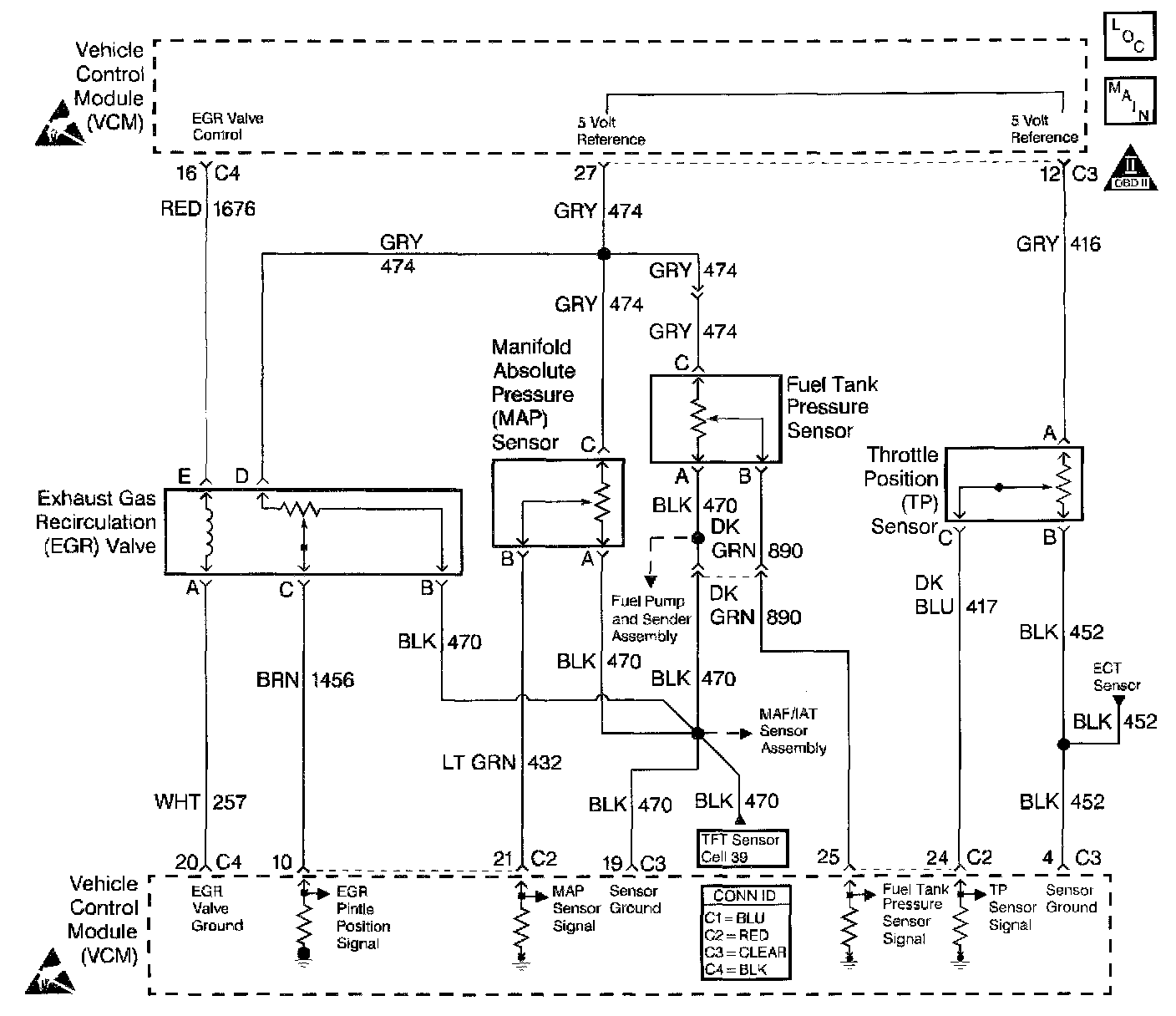 12. There are certain circuits in the VCM C4 connector that could cause a short to voltage to the EGR valve control circuit that may disappear when the C4 connector is disconnected. By checking each individual circuit for a short to the EGR valve control circuit with a DMM will confirm if such a condition exists.
