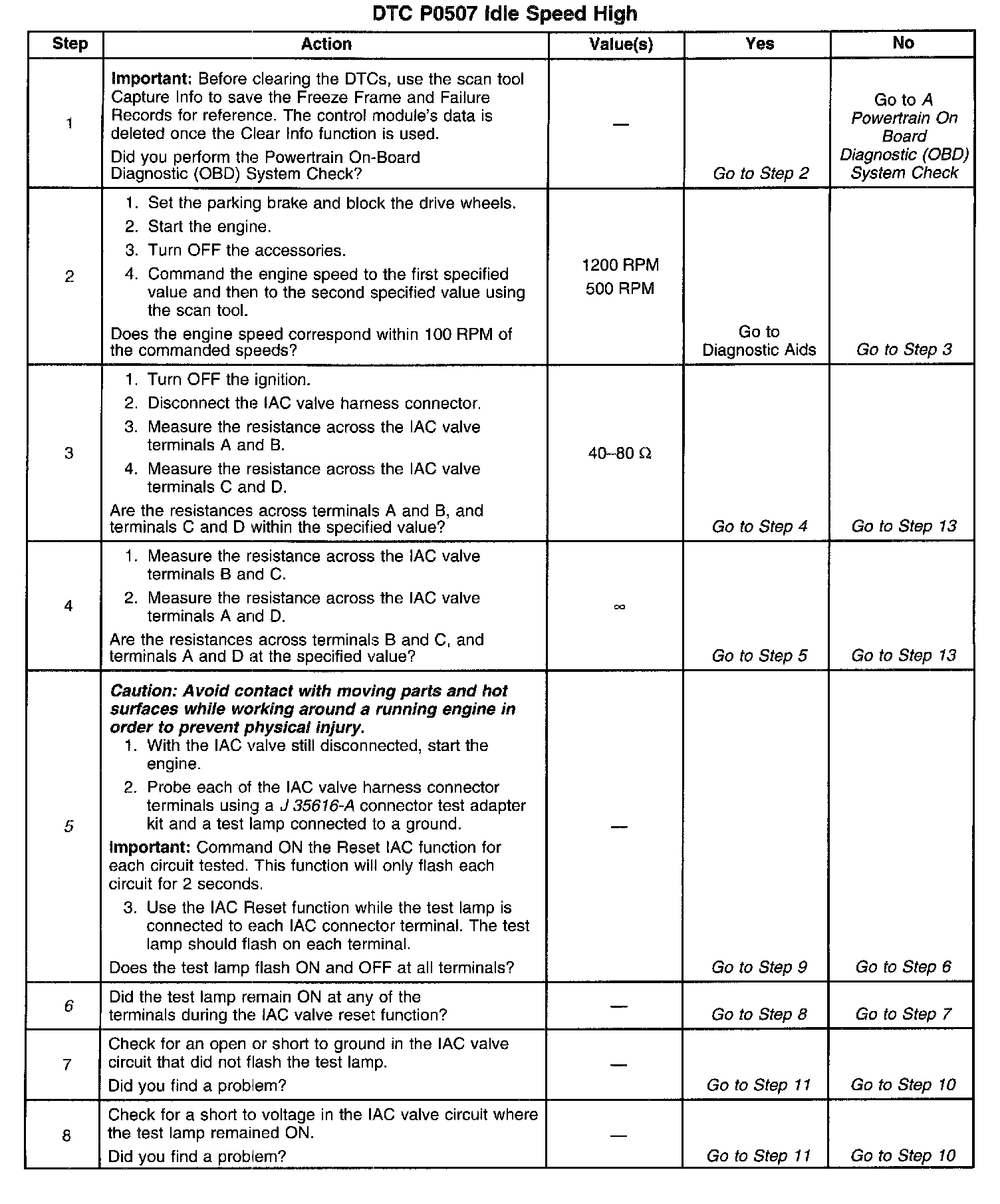 6. If the test lamp remained ON at any of the IAC valve harness connector terminals during the IAC valve reset function the circuit is shorted to voltage. If these circuits are checked before or after the IAC valve reset function it is possible that any combination of IAC circuits could light a test lamp, this would be a normal condition.