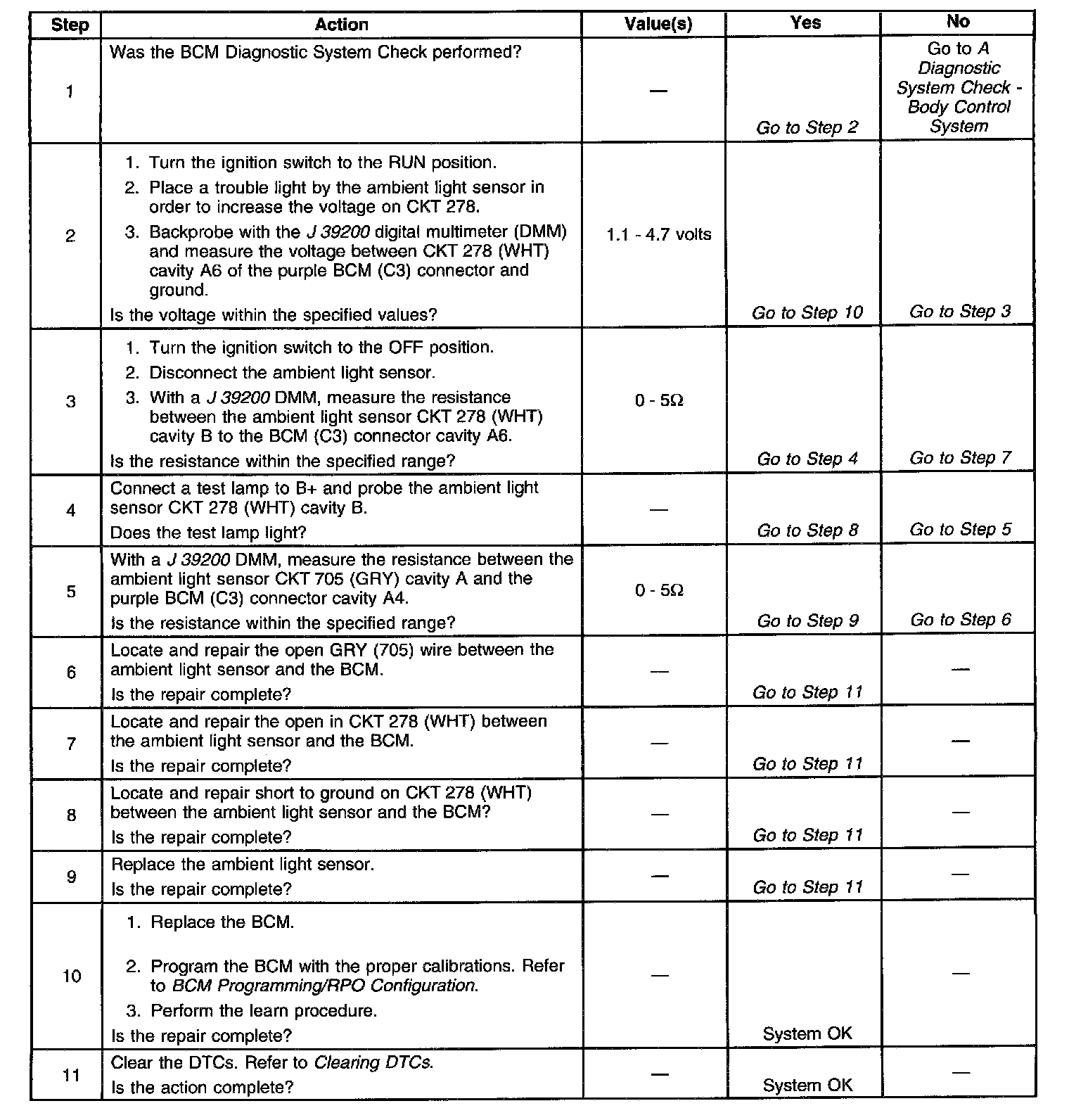 The Body Control Module (BCM) monitors CKT 278 in order to determine if the Daytime Running Lights (DRL) or the Auto Headlights (AHL) should be turned ON in the AUTO mode. When the BCM senses the ambient light sensor voltage between 1.7-4.7 volts (light state) the DRL will be commanded ON. When the BCM senses the ambient light sensor voltage between 0.2-1.0 volts (park state) the AHL will be commanded.