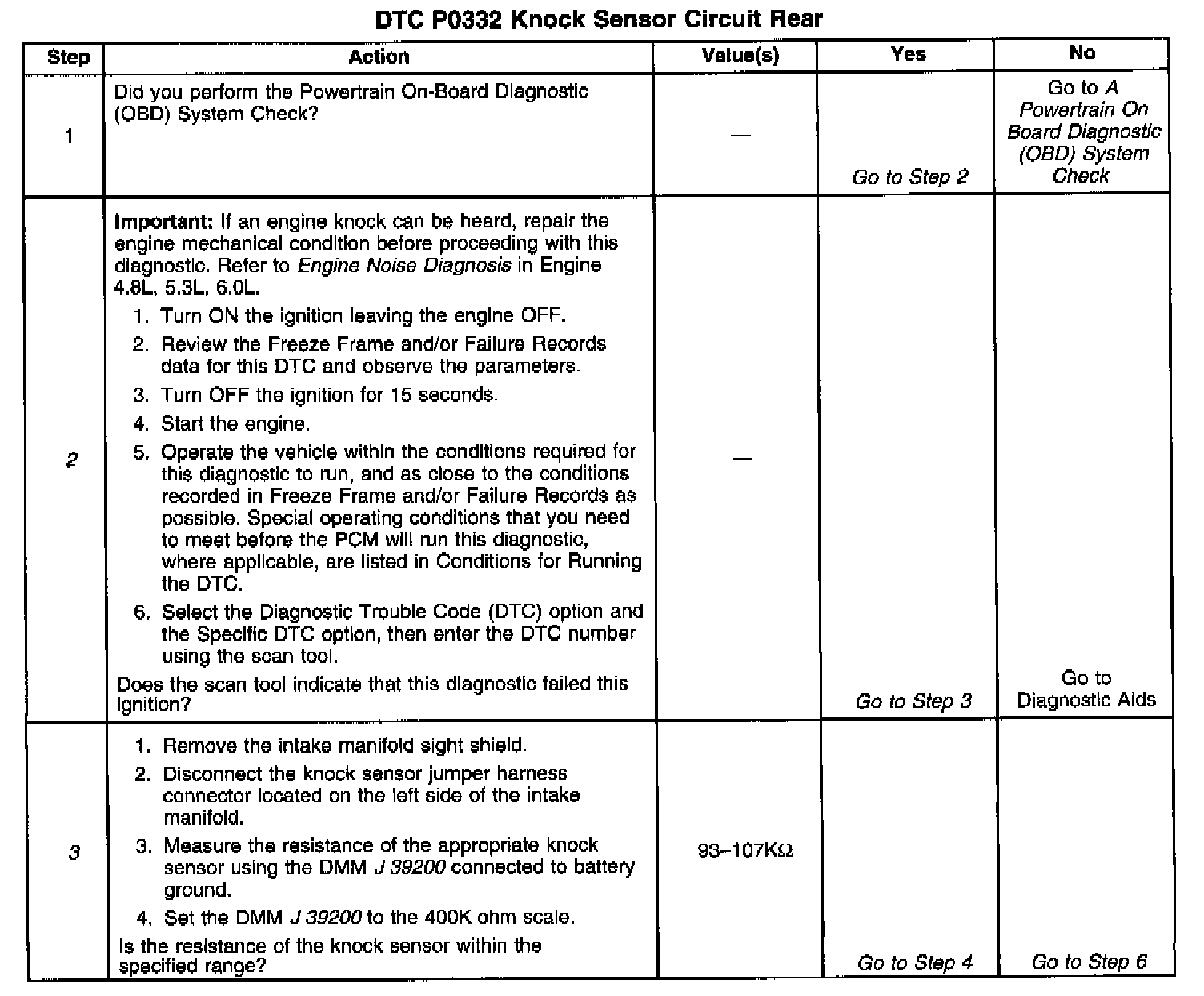 2. This verifies the malfunction is present. The scan tool will display DTC Ran=Yes and Pass=Int if the failure is intermittent. This indicates the diagnostic passed this ignition cycle and failed this ignition cycle. At this point the resistance of the knock sensors should be verified to be in the correct range. If the knock sensor resistances are correct, inspect the KS system wiring connections. When inspecting the KS system connections, start at the KS system jumper harness connector located on the left side of the intake manifold.