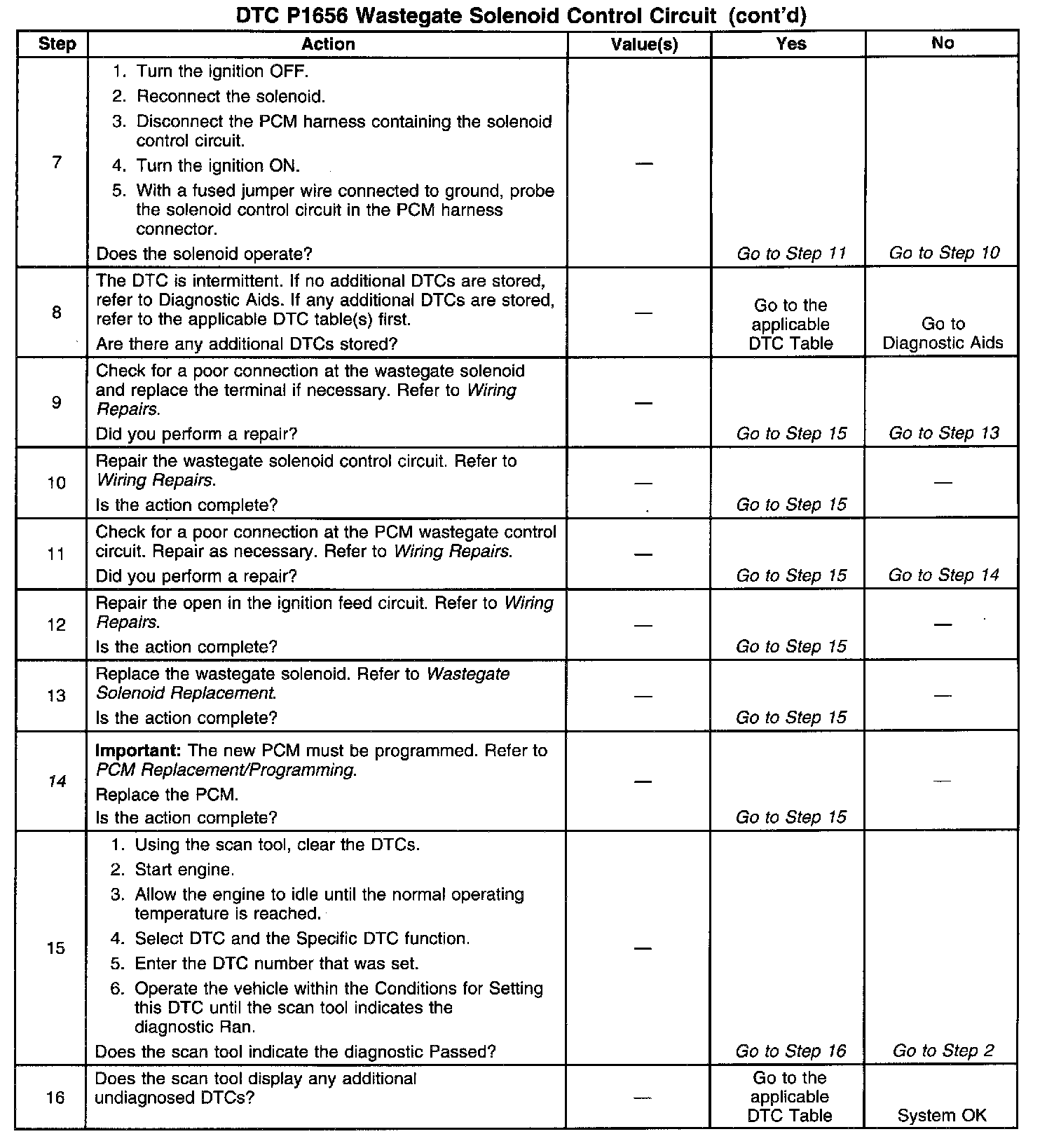 This diagnostic will set when the control circuit does not follow the PCM command (when the solenoid is requested ON, the voltage will drop; when the solenoid is OFF, the ignition voltage will be present). The scan tool has a 5 second ON time abort. The wastegate solenoid can be commanded ON for as many times as needed, in 5 second intervals. DTC P0236 may possibly set along with DTC P1656. This diagnostic can be checked during key up. The engine will not respond to the scan tool commands at the idle (the engine is unable to achieve the boost pressures that are greater than BARO at idle) or at any engine speed which is greater than the idle (the PCM control abort in order to prevent the engine damage).