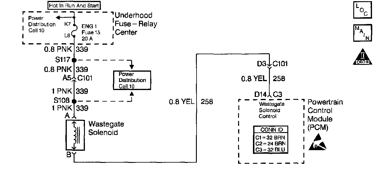 The Turbocharger Wastegate is a vacuum actuated valve which is used in order to control the exhaust gas heat which is sent to the turbo. The wastegate pulse width modulated solenoid meters the vacuum level at the wastegate valve actuator as commanded by the Powertrain Control Module (PCM). When the PCM is commanding the Wastegate solenoid ON, the voltage potential of the circuit will be low (near 0 volts). When the PCM is commanding the wastegate solenoid OFF, the voltage potential of the circuit will be high (near the battery volts). The primary function of the PCM in this circuit is to supply the ground for the wastegate solenoid.
