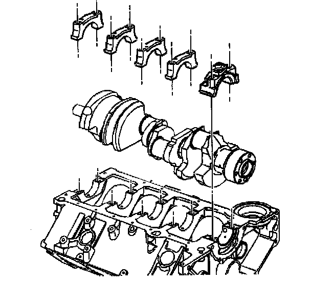Component DescriptionThere are five crankshaft bearings numbered 1 through 5, as viewed from the front of the engine. There is an arrow on each bearing cap that points toward the front of the engine. The center crankshaft bearing, number three, is the thrust bearing.