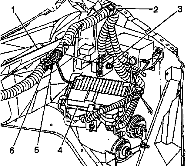 4. Remove the bolt (2) retaining the bracket (1) to the engine block.