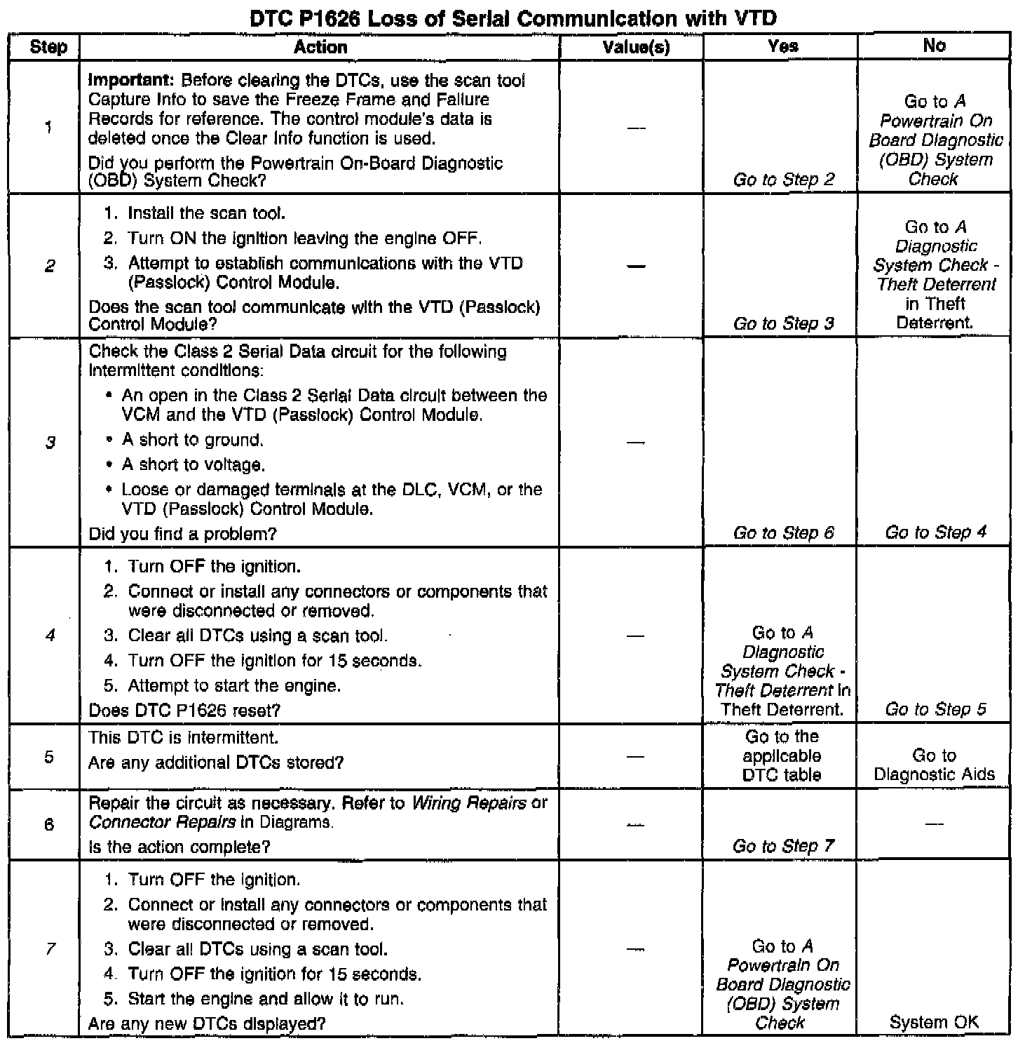 ^ If the Class 2 serial data circuit is shorted to ground or shorted to voltage, then all systems connected to the serial data circuit will not be able to communicate properly. Systems capable of storing loss of communications DTCs (DTCs with the letter U as a prefix) will have these codes stored in their memory. If a DTC U1192 is stored in the VCM memory along with the P1626, then a fault occurred at some point after the VCM received the correct password. The VTD must also be checked for intermittent operation due to a loss of power or ground to the module itself. After repairing the cause of DTC 1626, clear all DTCs from the systems capable of storing this DTC and DTC U1192.