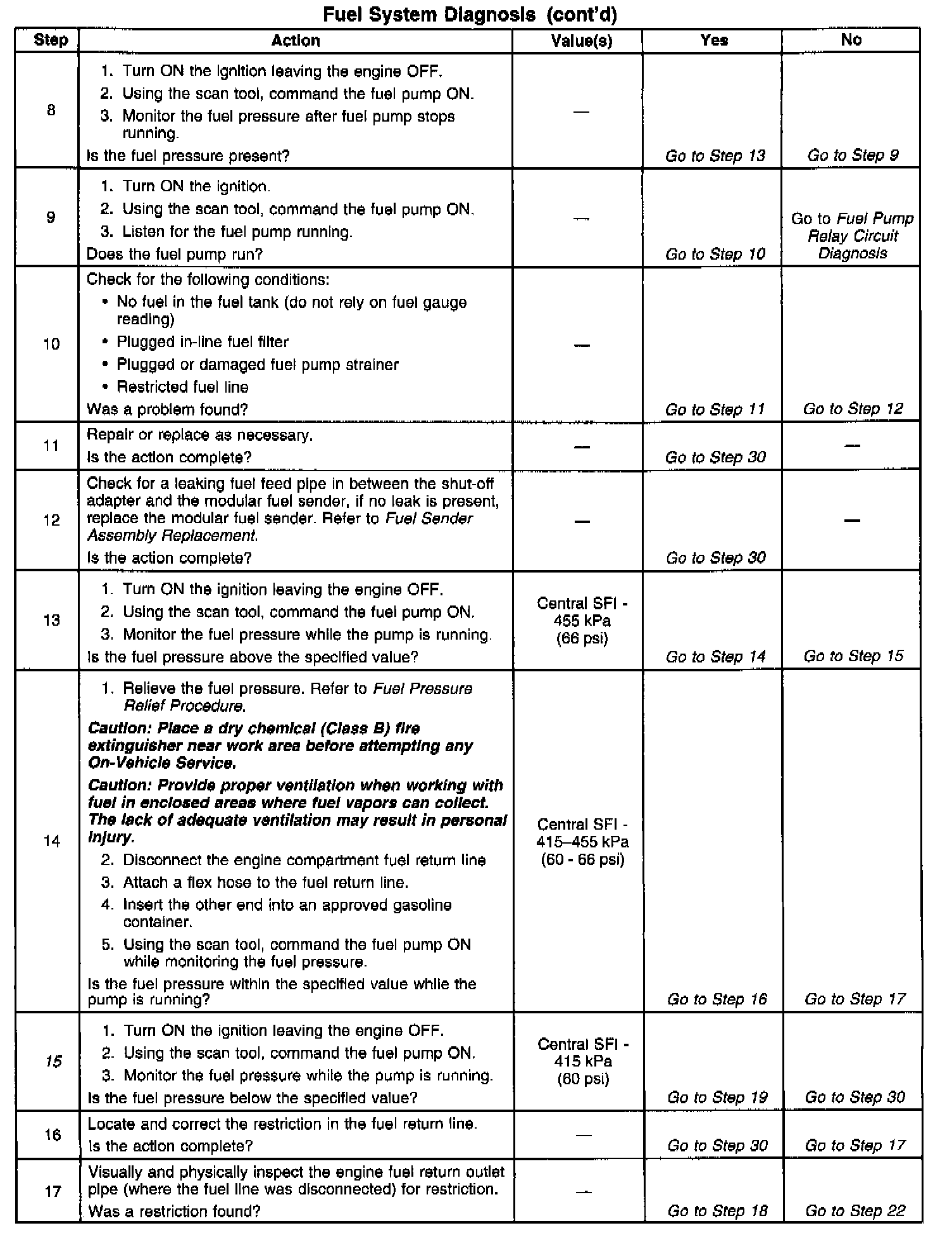 ^ The pressure is regulated but less than 379 kPa (55 psi).The amount of fuel reaching the injector is sufficient, but the pressure is too low. The system will run lean, hard starting cold, no start, overall poor performance, and may set a DTC. Refer to Engine Cranks but Does Not Run. Engine Cranks But Does Not Run