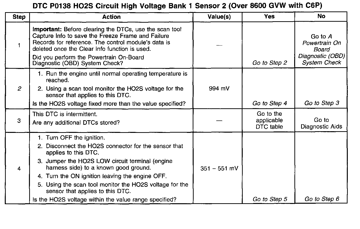 ^ The fuel pressure: If the pressure is too high, the system will run rich. The VCM can compensate for some increase; however, if the pressure gets too high, the DTC P0138 may set. Refer to Fuel System Diagnosis. Component Tests and General Diagnostics