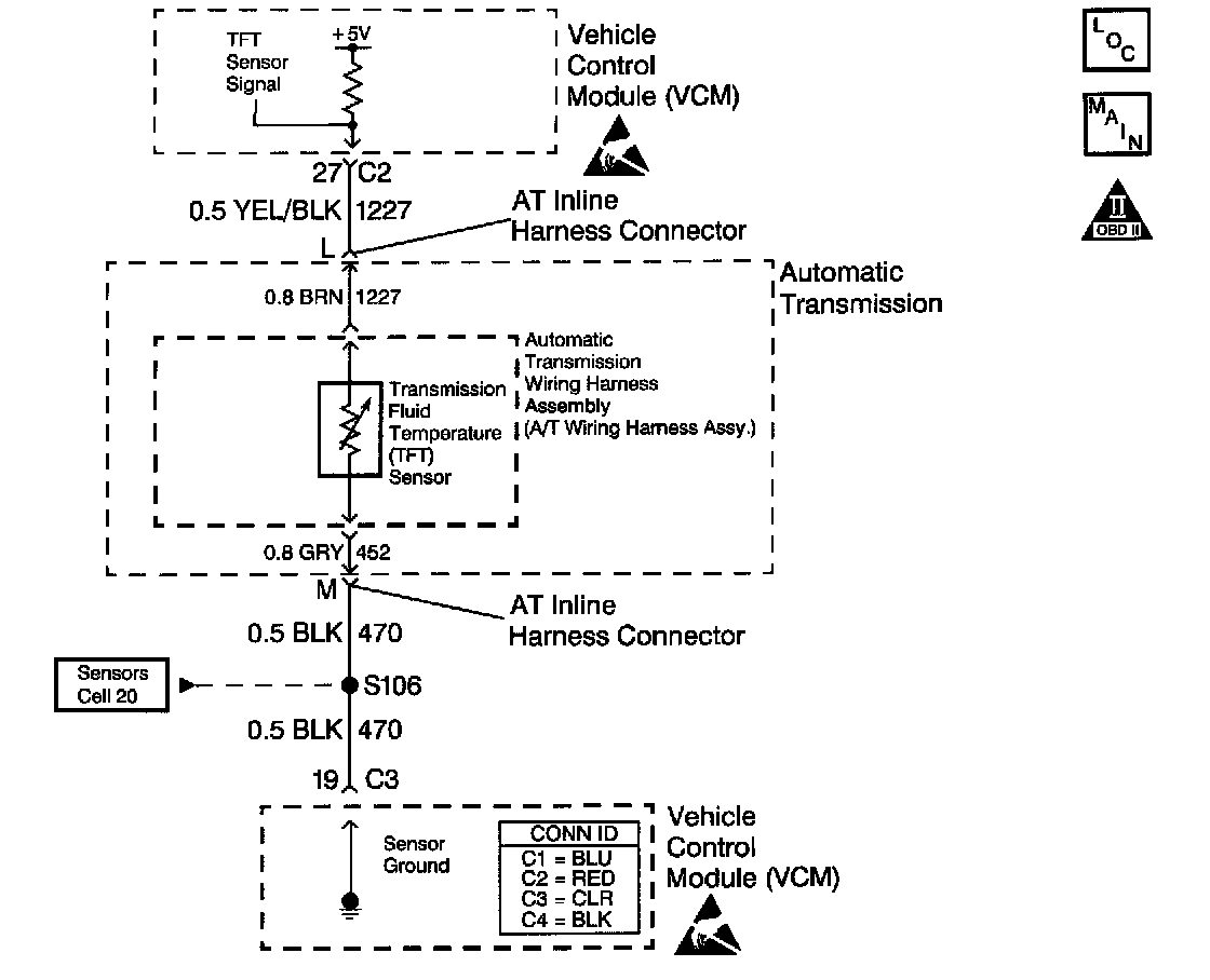 The automatic Transmission Fluid Temperature (TFT) sensor is part of the 4L80-E Automatic Transmission (AT) wiring harness assembly. The TFT sensor is a resistor, or thermistor, which changes value based on temperature. The sensor has a negative-temperature coefficient. This means that as the temperature increases, the resistance decreases, and as the temperature decreases the resistance increases. The Vehicle Control Module (VCM) supplies a 5-volt reference signal to the sensor on circuit 1227 and measures the voltage drop in the circuit. When the transmission fluid is cold, the sensor resistance is high and the VCM detects high signal voltage. As the fluid temperature warms to a normal operating temperature, the resistance becomes less and the signal voltage decreases. The VCM uses this information to control shift quality and torque converter clutch apply.
