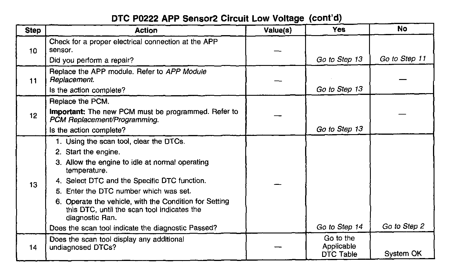 There are no driveability issues associated with the APP module unless a DTC is present. The most likely causes of this DTC are poor connections or the sensor itself. The least likely is a PCM problem. A scan tool reads APP 2 position in volts and should read about 4.5 volts with the throttle closed and the ignition ON or at idle. Voltage should decrease at a steady rate as the throttle is moved toward WOT. Also, 90% pedal travel is acceptable for correct APP operation. Scan APP 2 sensor while depressing the accelerator pedal with the engine off and ignition ON. Display should vary from about 4.5 volts when the throttle is closed to about 1.5 volts when the throttle is held at Wide Open Throttle (WOT).
