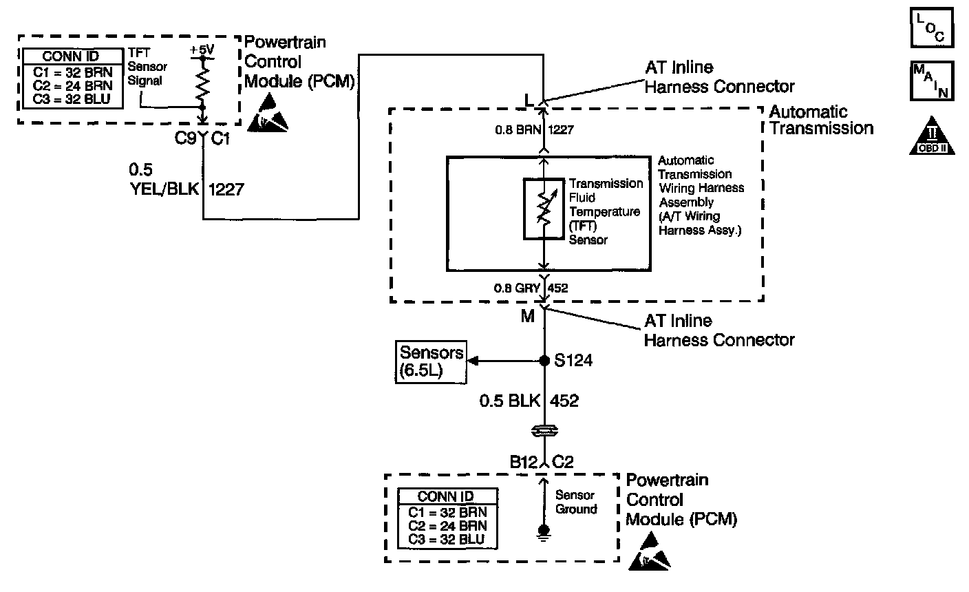 The automatic Transmission Fluid Temperature (TFT) sensor is pan of the 4L80-E Automatic Transmission (AT) wiring harness assembly. The TFT sensor is a resistor, or thermistor, which changes value based on temperature. The sensor has a negative-temperature coefficient. This means that as the temperature increases, the resistance decreases, and as the temperature decreases the resistance increases. The Powertrain Control Module (PCM) supplies a 5-volt reference signal to the sensor on circuit 1227 and measures the voltage drop in the circuit. When the transmission fluid is cold, the sensor resistance is high and the PCM detects high signal voltage. As the fluid temperature warms to a normal operating temperature, the resistance becomes less and the signal voltage decreases. The PCM uses this information to control shift quality and torque convener clutch apply.