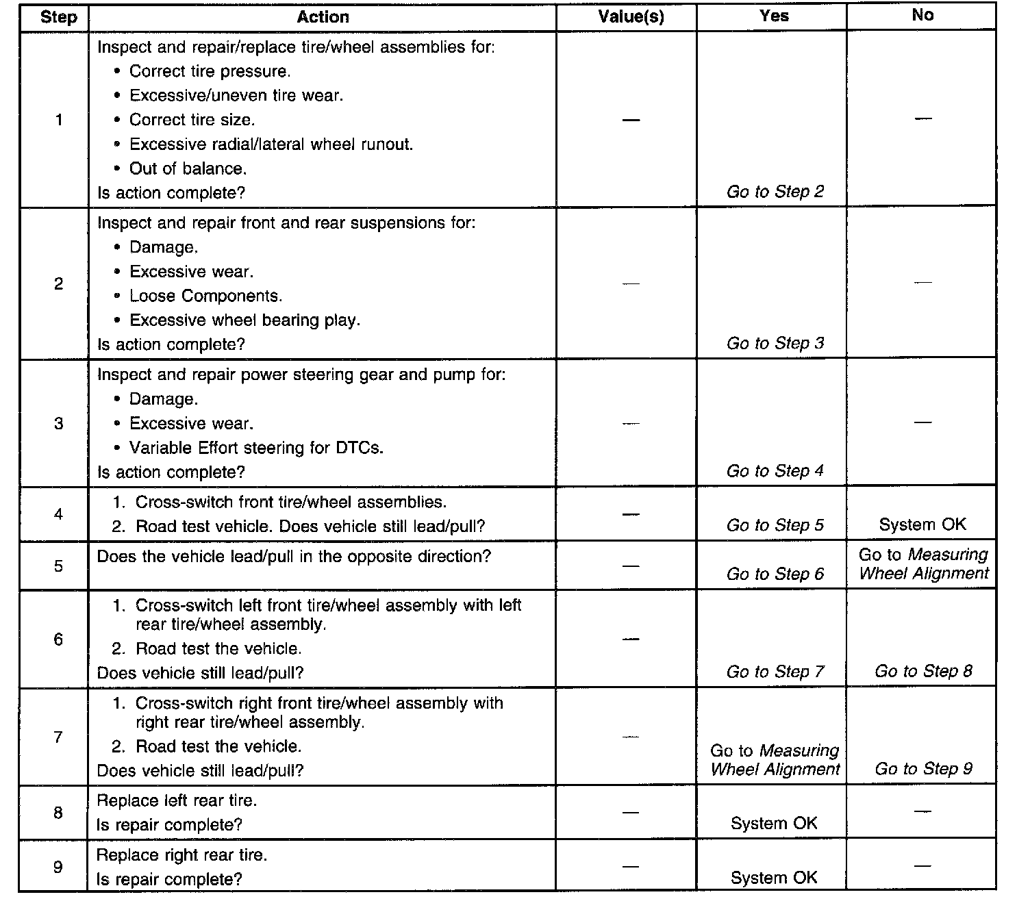 Use the lead/pull correction table in order to verify that improper tire and wheel alignment is not mistaken for tire lead.
