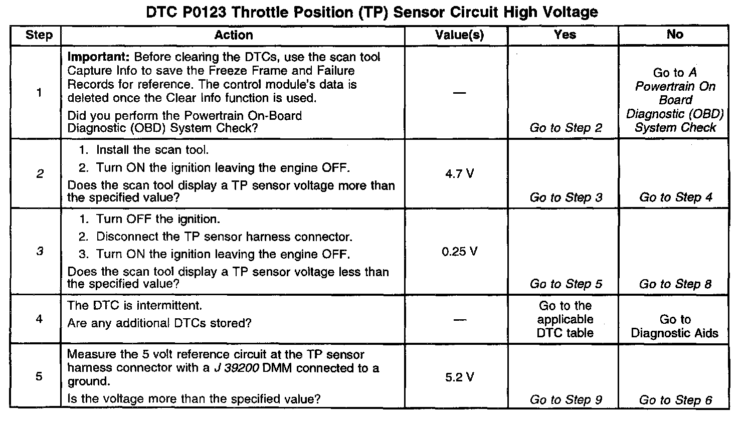 3. With the TP sensor disconnected, and if the VCM and the wiring are okay, the TP signal should go below 0.25 volt. This test could set a DTC P0122.