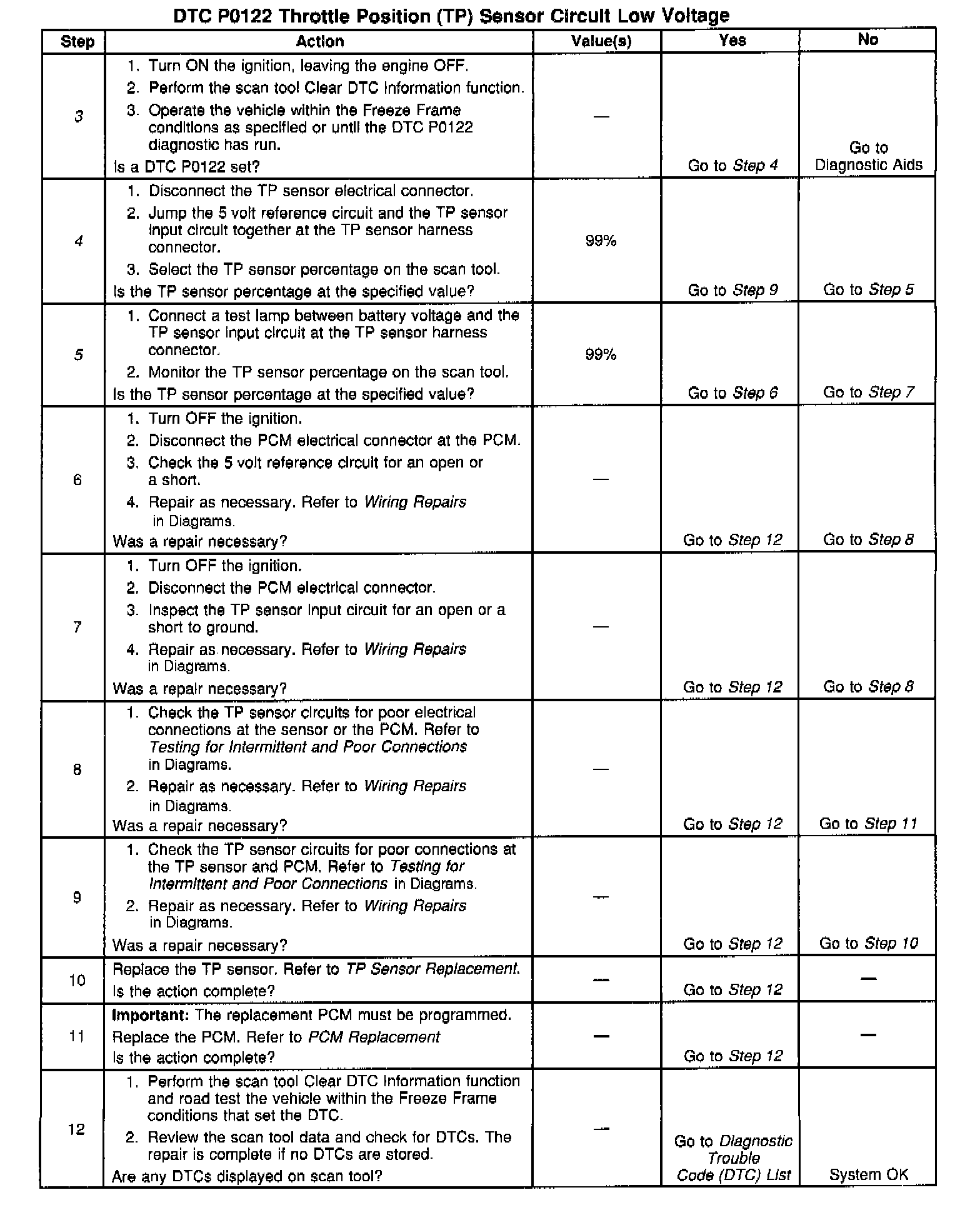 If you cannot duplicate the DTC P0122, the information included in the Freeze Frame data can be useful in determining vehicle operating conditions when the DTC was first set.