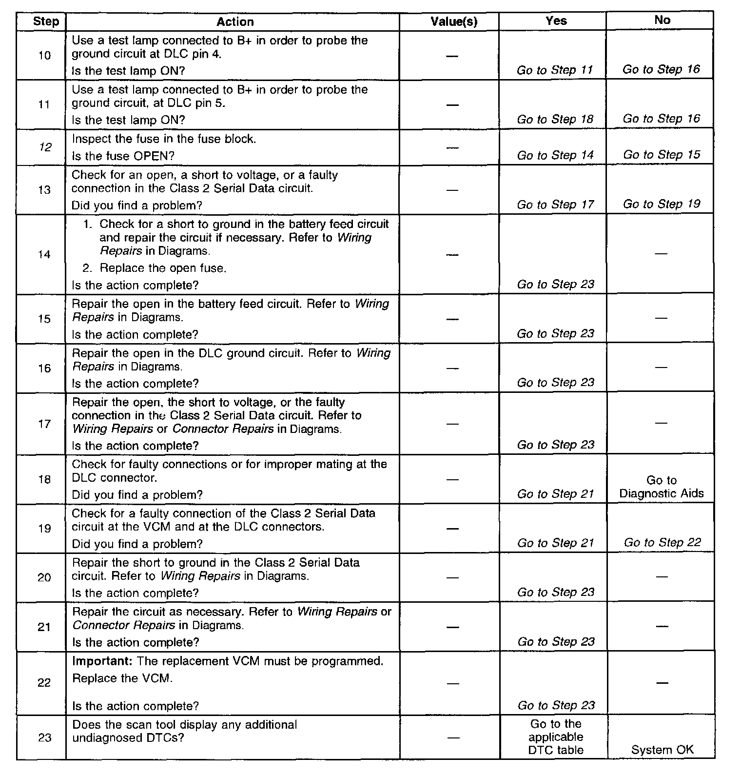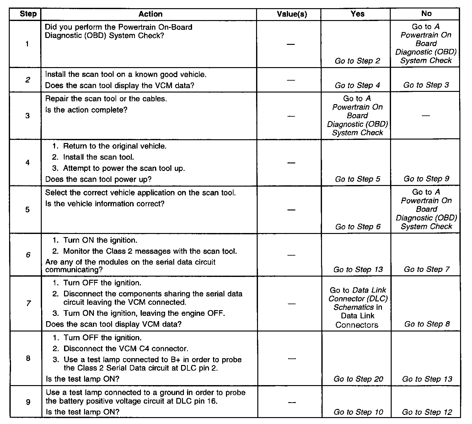 The Class 2 Serial Data circuit to the Data Link Connector (DLC) allows bi-directional communication between the Vehicle Control Module (VCM) and the scan tool. This is accomplished through pin 2 of the DLC. If communication between the scan tool and the VCM cannot be established, use the procedure in the DLC diagnosis table in order to diagnose the condition.
