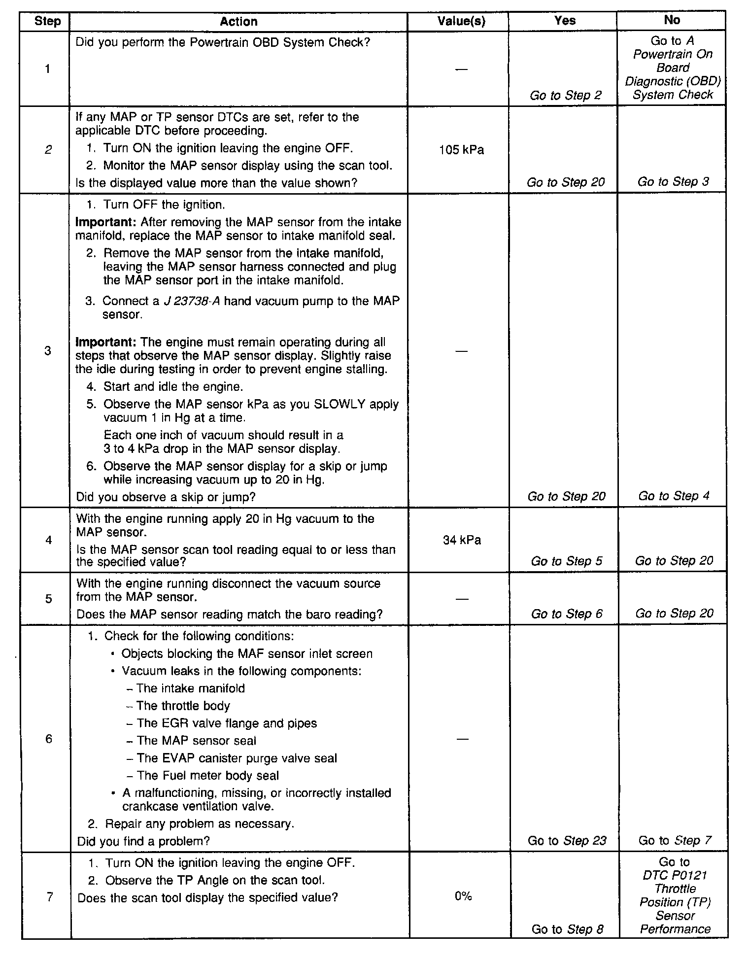 The VCM monitors the MAF sensor air flow rate and compares this signal to a VCM calculated air flow rate. The calculated air flow is based on engine speed and barometric pressure. The VCM uses the MAP sensor in order to determine the barometric pressure when the ignition key is turned ON but before the engine is cranking or running. This DTC will be set if the MAF sensor signal airflow rate does not match the air flow rate calculated by the VCM.