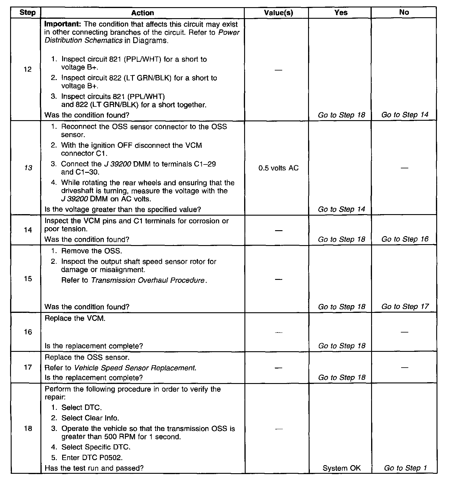 It the VCM detects a low vehicle speed and there is a high engine speed in a drive gear range, DTC P0502 sets. DTC P0502 is a type C DTC. For California emissions, DTC P0502 is a type B DTC.