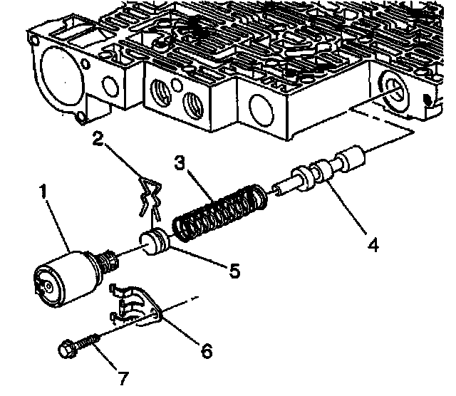 8. Remove the solenoid retainer bolt (7) and the solenoid retainer (6). Remove the pressure control solenoid (1).