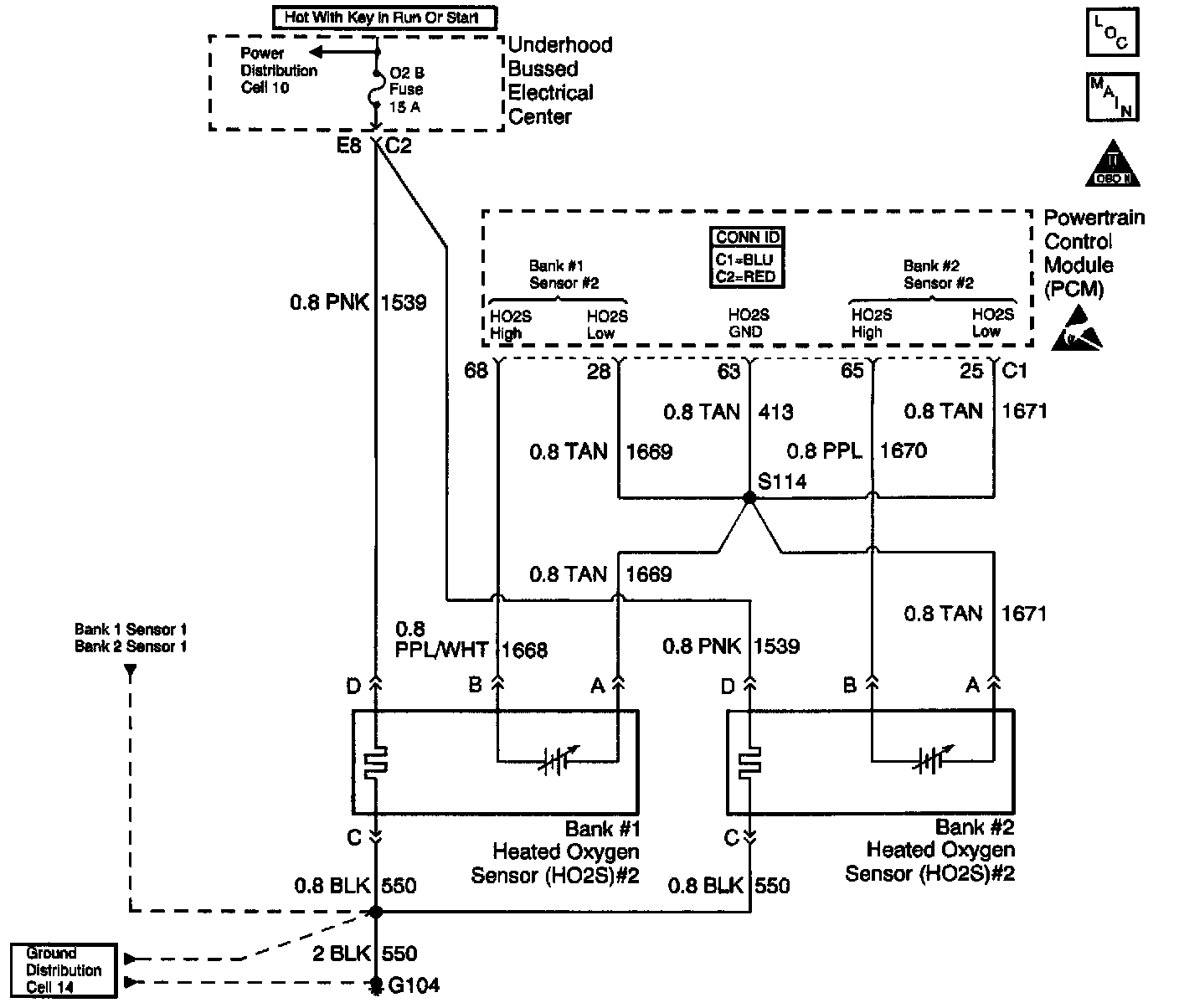 ^ A malfunctioning HO2S heater or heater circuit - With the ignition ON and the engine OFF, the HO2S voltage displayed on a scan tool should gradually drop to below 0.150 volt, indicating that the heater works properly. If not, disconnect the HO2S and connect a test lamp between the terminals C and D. If the test lamp does not light, repair the open in the HO2S ground circuit or the HO2S ignition positive voltage circuit. If the test lamp lights, replace the HO2S.