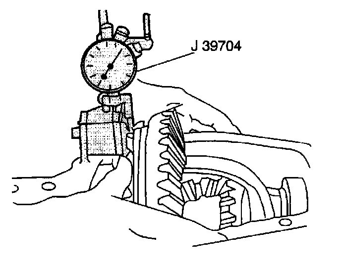 8. Force the differential case as far as possible in the direction away from the J 39704. Repeat this step until the same reading is obtained.