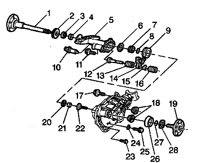 4. Attach a slide hammer with an adapter to the axle shaft (output shaft) (19). Pull the axle shaft from the case.