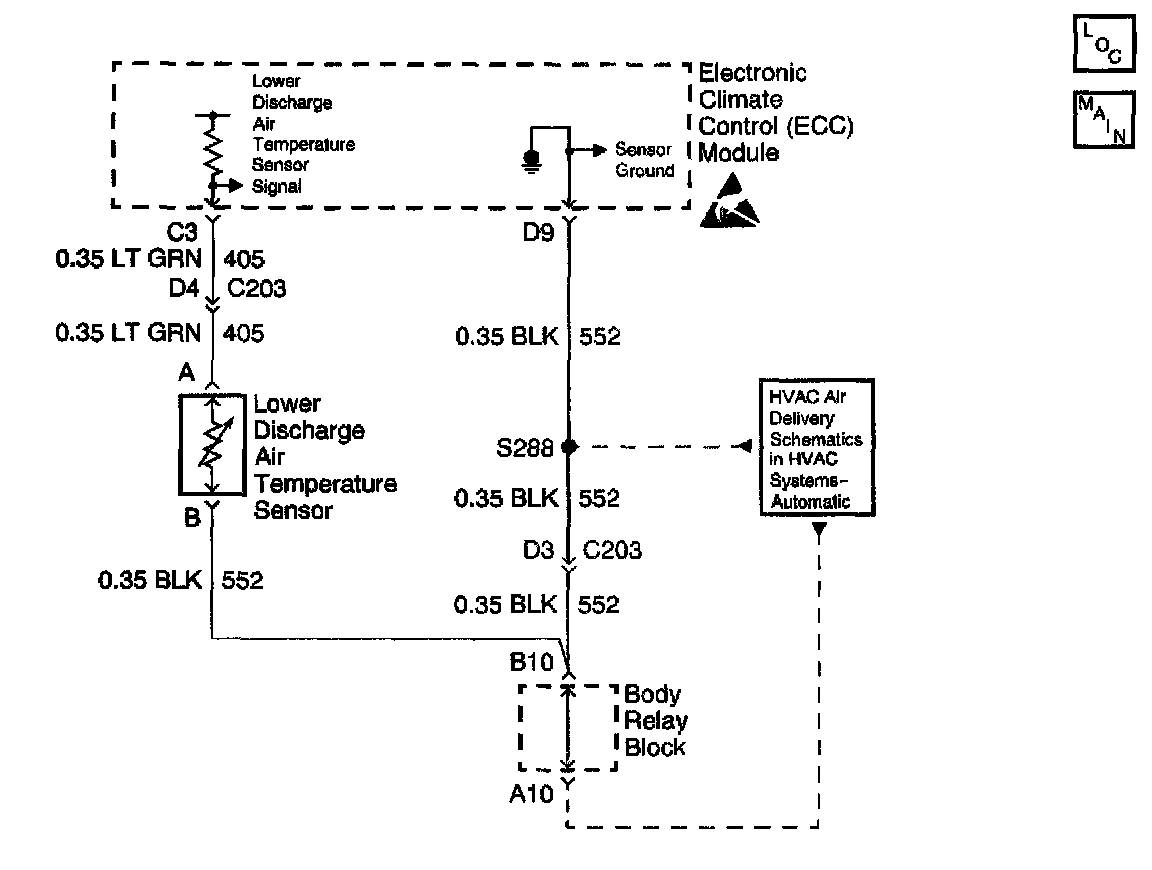 The HVAC control module monitors the lower duct air temperature via a lower air temperature sensor. When the air is cold, the sensor resistance and the signal voltage are high. When the air is warm, the sensor resistance and the signal voltage are low. The HVAC control module requests the A/C compressor clutch engagement and controls the air temperature actuator door position in order to maintain the temperature selected on the HVAC control module.