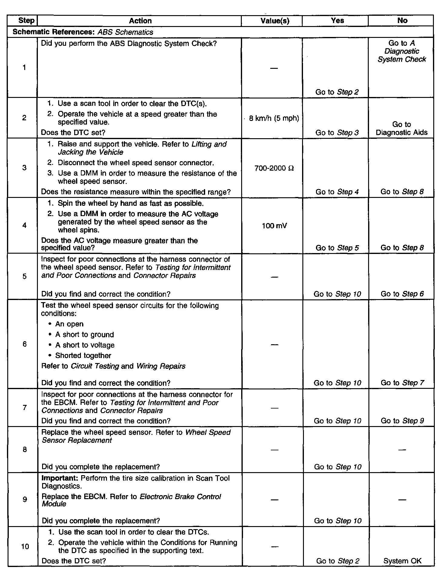 The corresponding wheel speed sensor feedback voltage is detected as being high (above 3.33 volts) for 100 milliseconds or low (below 0.039 volts) for 500 milliseconds.