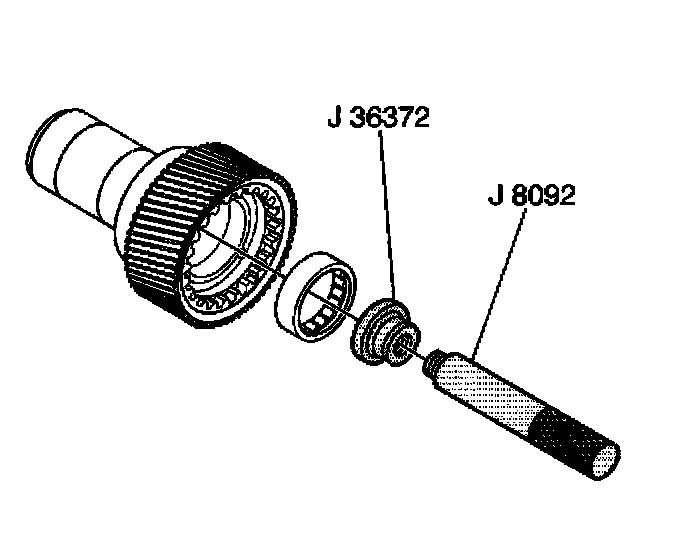 43. Using J 33790 and J 8092, remove the output shaft rear bearing from the output shaft rear retainer housing.