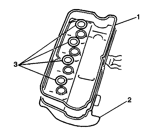 1. Install the new valve rocker arm cover gasket (1) and four O-rings (3) to the valve rocker arm cover (2).