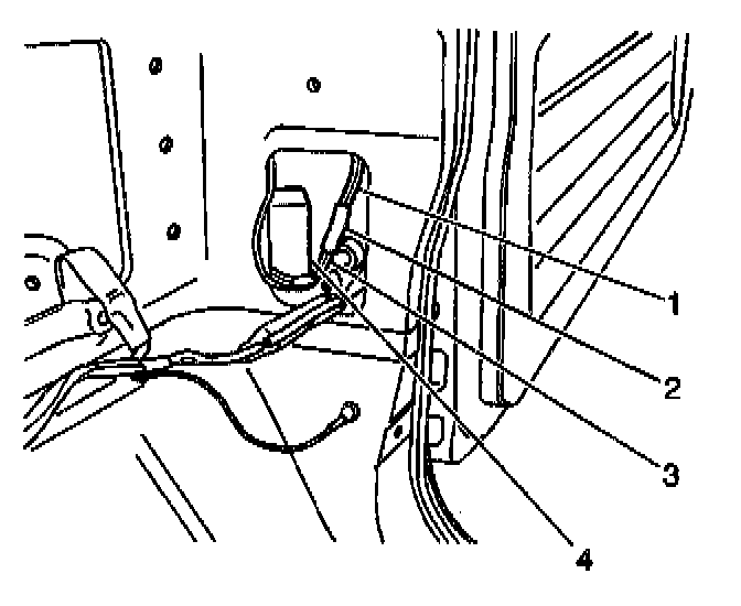 4. Remove the rear window washer nozzle hose (1) from the rear window washer nozzle hose connector (2) in the right rear quarter of the vehicle near the rear door wiring harness grommet.