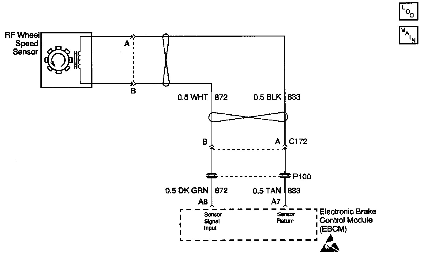 The speed sensor used on this vehicle is a multiple pole magnetic pickup. This sensor produces an AC signal that the EBCM uses the frequency from to calculate the wheel speed.